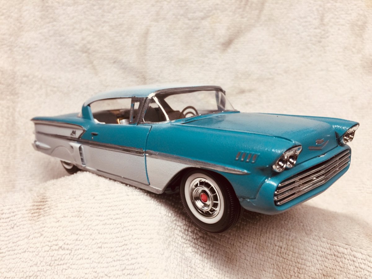 1958 Impala AMT kit, done in almost full Custom treatment Left off tacky spotlights and antenna All that chrome trim was an exercise in futility Caddy white walls n caps courtesy of a Revell ‘59 DeVille kit The details of this kit is amazing Chrome crankshaft for the engine and tiny little rocker arms under valve covers Sent from my iPhone using The H.A.M.B. mobile app