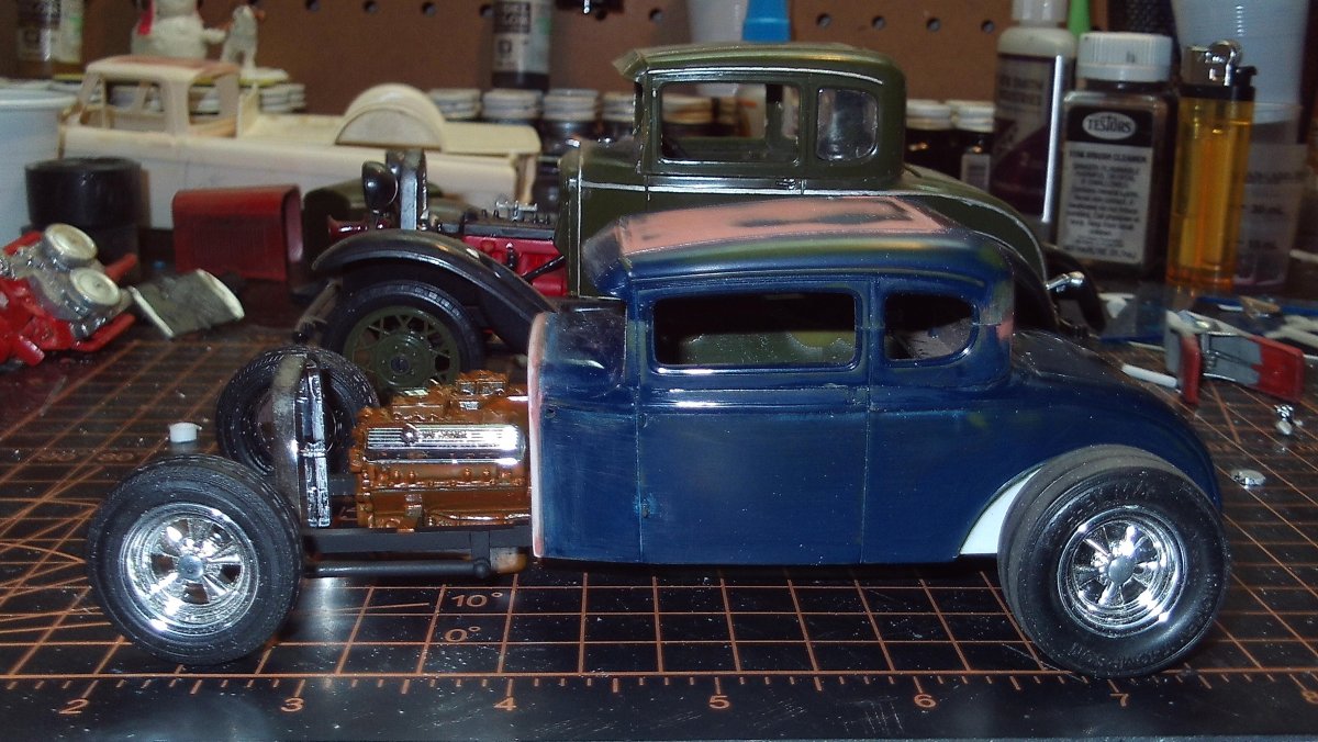 Started this old Model A kit, I scratch built the frame, chopped the top & found a big mopar for it. I can't decide which wheels & tires to use. Love to hear your choices...