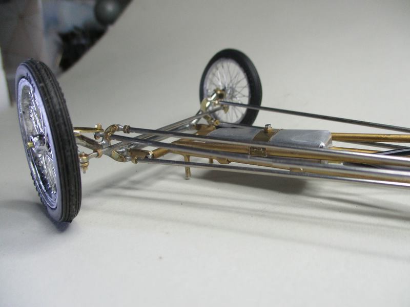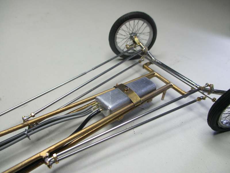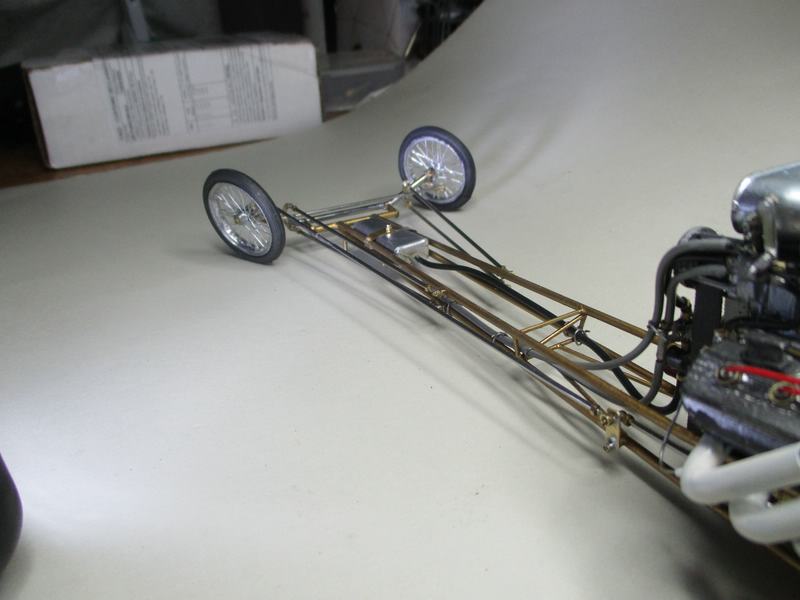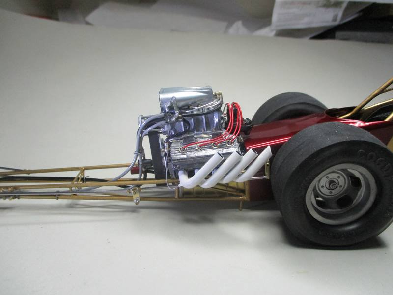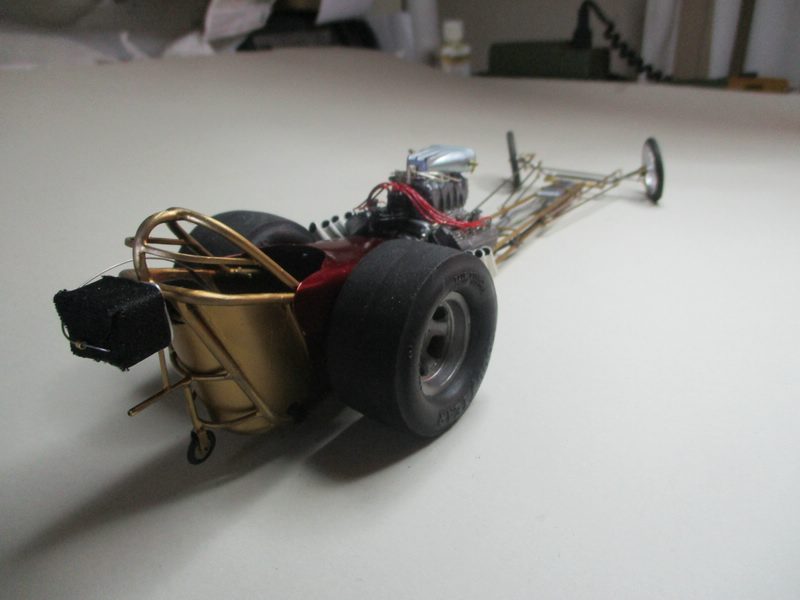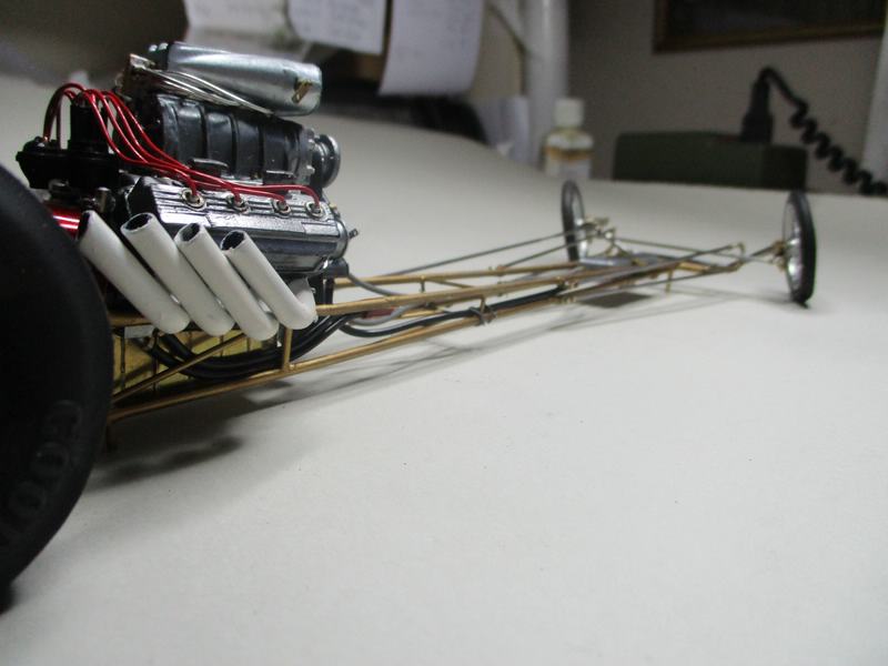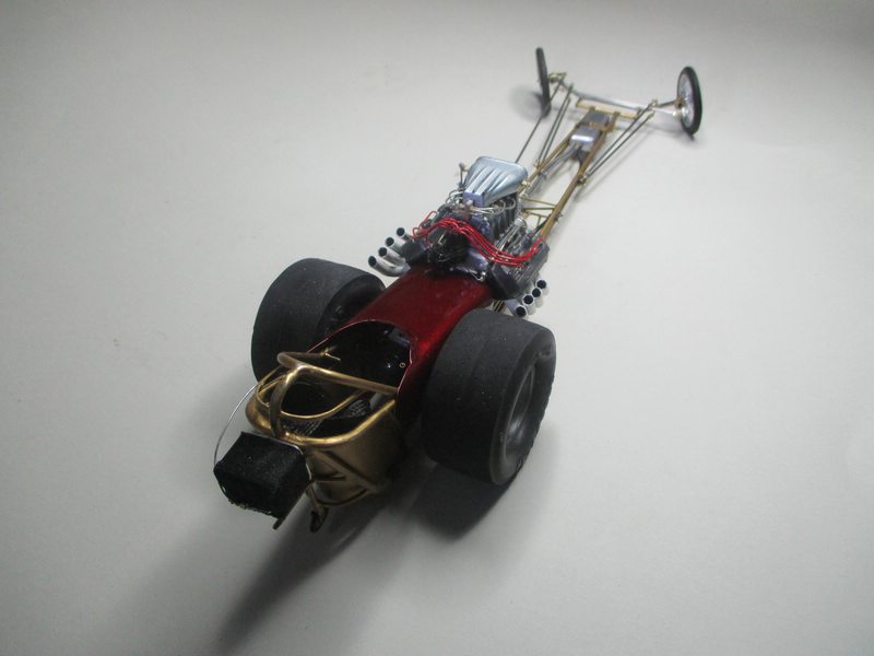 COMPLETED! Vintage 1965, Woody Gilmore 150", brass scratch build, 1:16 scale. Motor is a resin kit, CompResins, just changed a lots of things. Rear tires and wheels are of Revell Funny Car vintage. Front wheels are 40 spoke wire laced. Brass tube chassis following original plans. Paint is a mix from House of Kolor and Specialist Paints, Candy Apple Red. Maybe tomorrow a light box session. Exhaust tips need some black inside the pipes and the slicks need a tad more sanding to get rid of the seam. Immensely grateful for the positive feedback, truly the best incentive to maintain momentum. Many thanks guys! Mike..