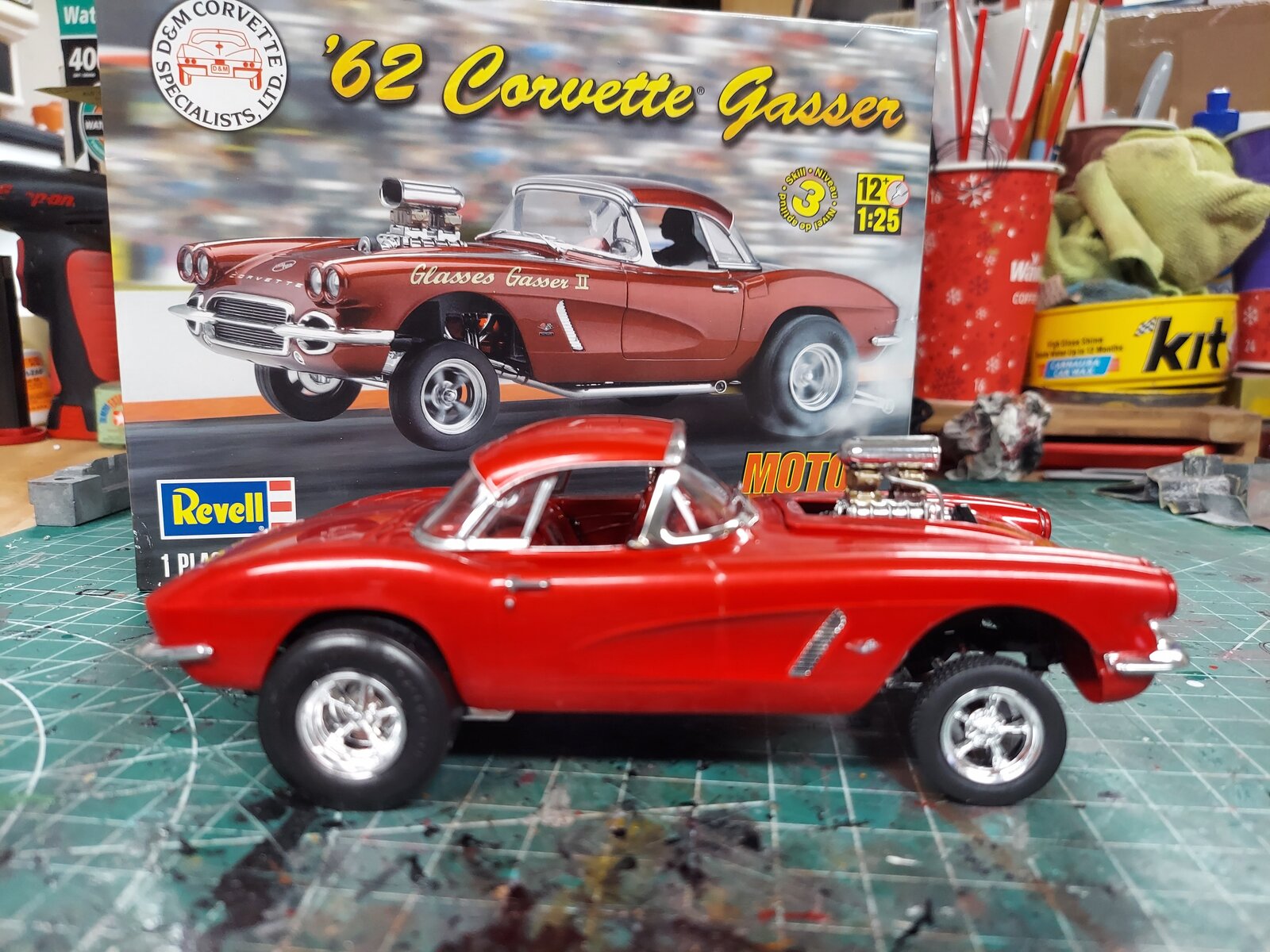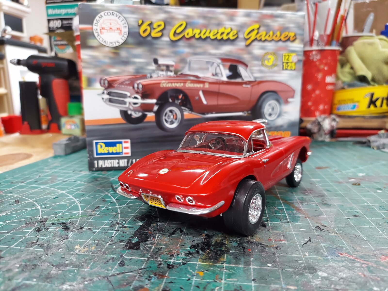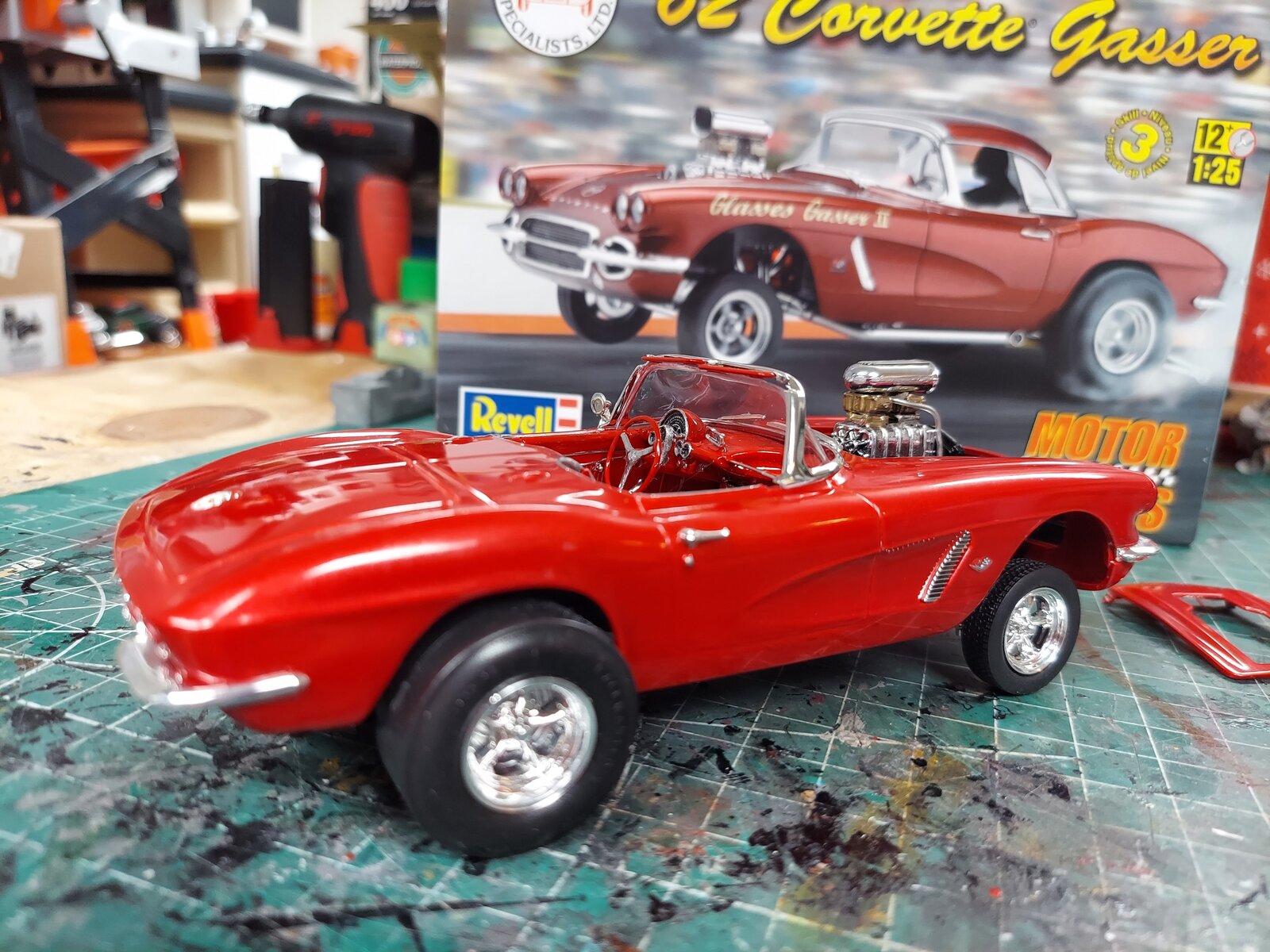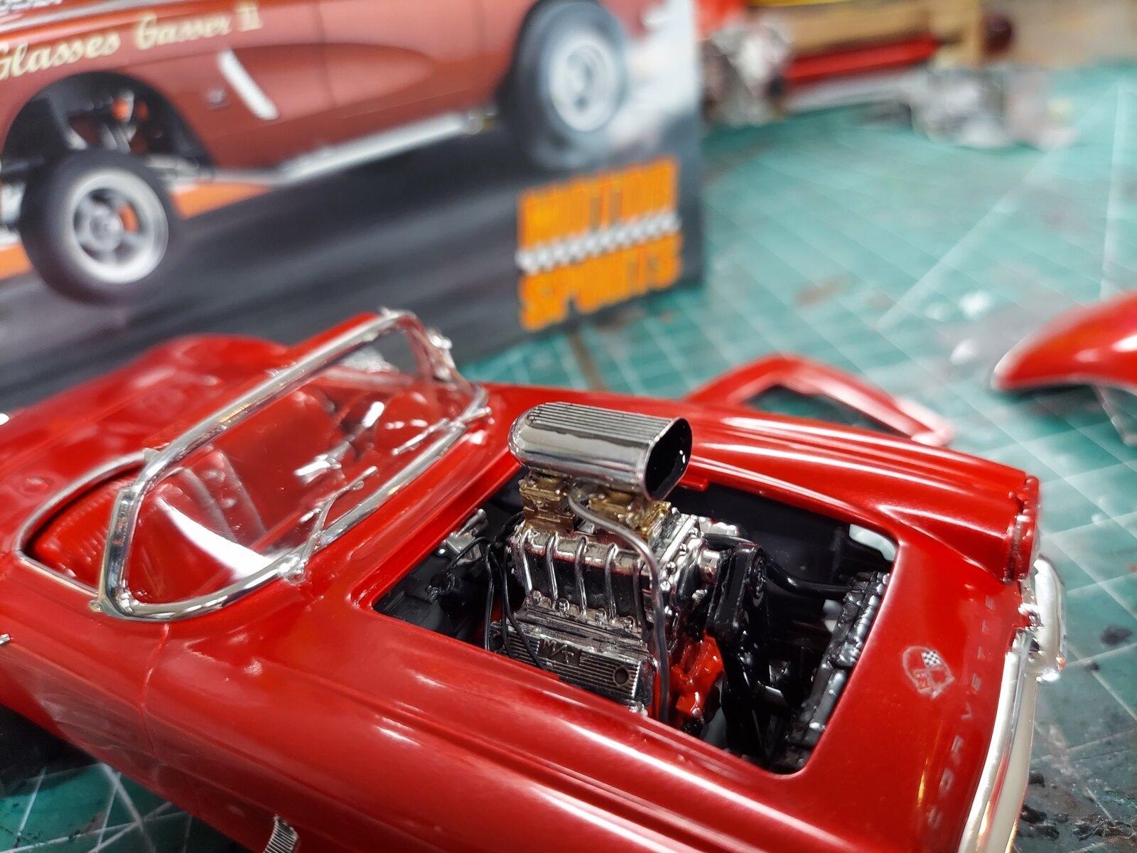 I just started on this BIG (1/12th scale) Corvette. Sprayed a lacquer white base coat to cover the dark red plastic, Duplicolor silver base just sprayed. I will bare metal foil all the chrome, do the hood stripe decal and bury it all in Duplicolor clear. Then color sand and rub. Interior is flat red, and will be foiled and detailed. Engine will be fully wired and have heater hoses, I might do fuel lines, might not. This box stock/factory stock build is nice after doing a bunch of builds with lots of modifications.