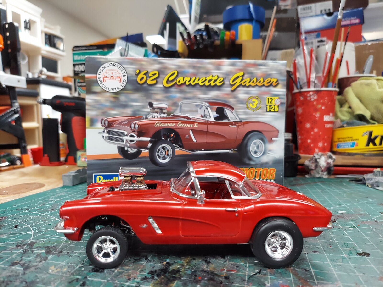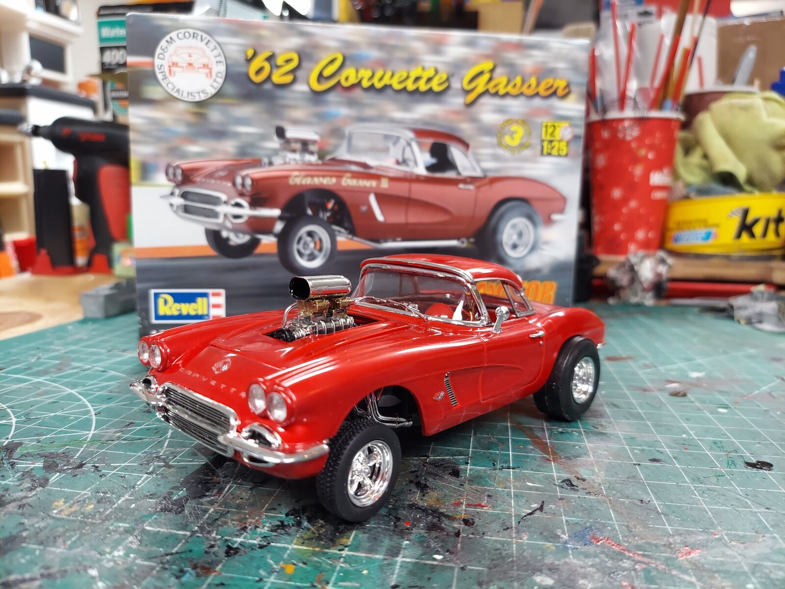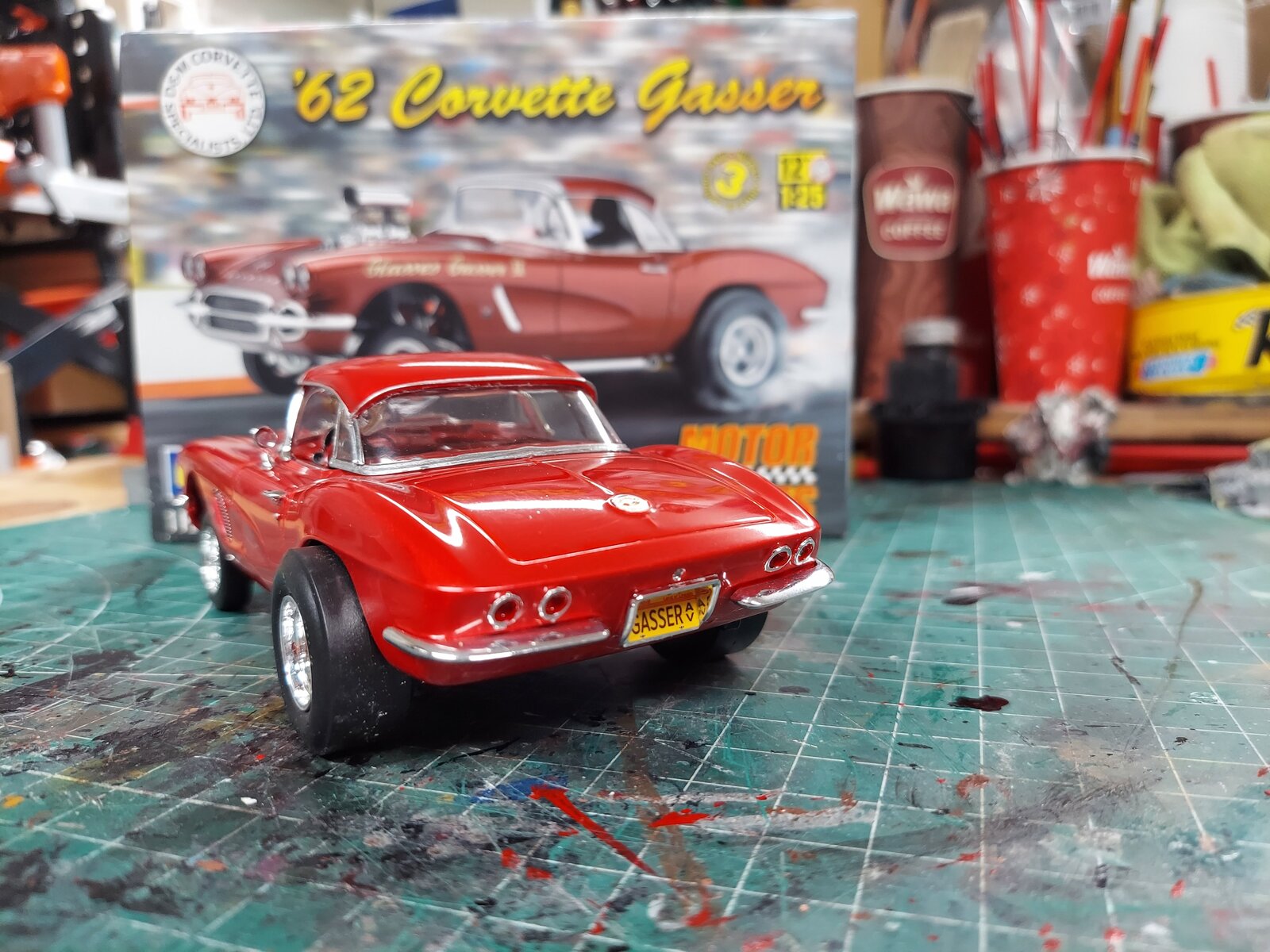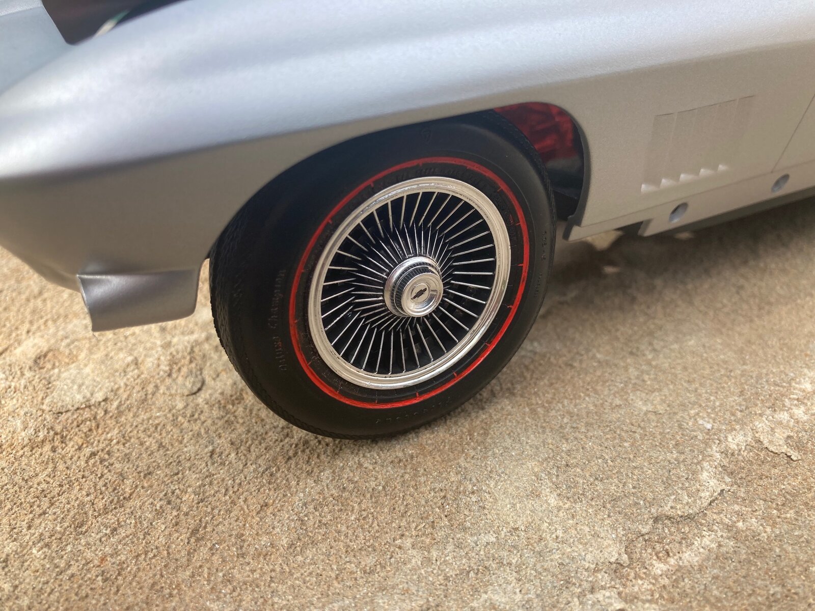 I just started on this BIG (1/12th scale) Corvette. Sprayed a lacquer white base coat to cover the dark red plastic, Duplicolor silver base just sprayed. I will bare metal foil all the chrome, do the hood stripe decal and bury it all in Duplicolor clear. Then color sand and rub. Interior is flat red, and will be foiled and detailed. Engine will be fully wired and have heater hoses, I might do fuel lines, might not. This box stock/factory stock build is nice after doing a bunch of builds with lots of modifications.