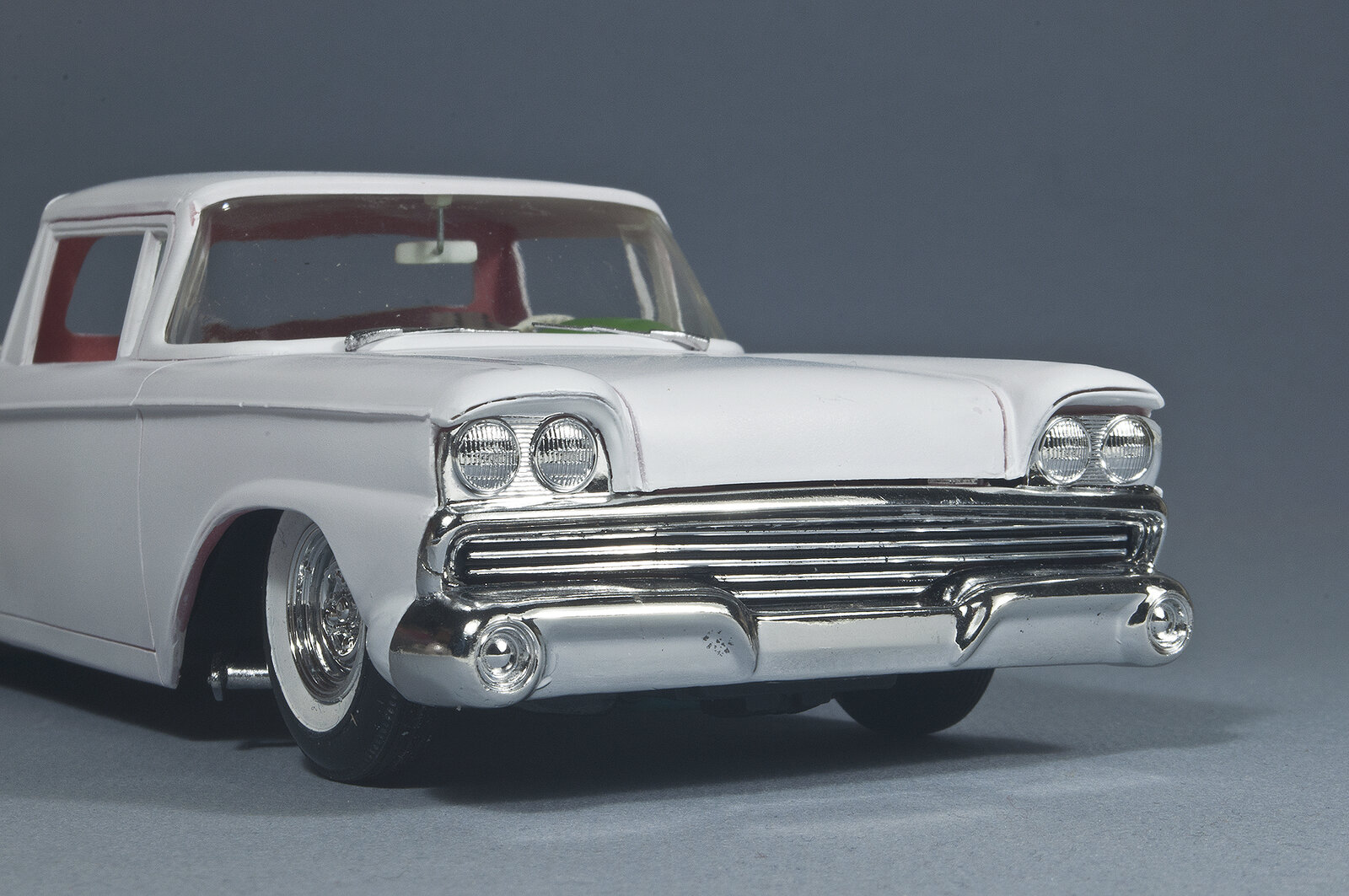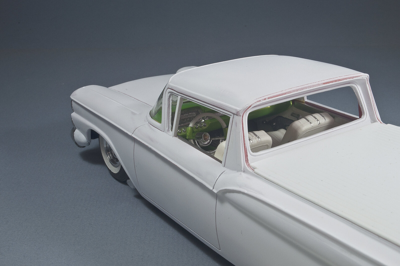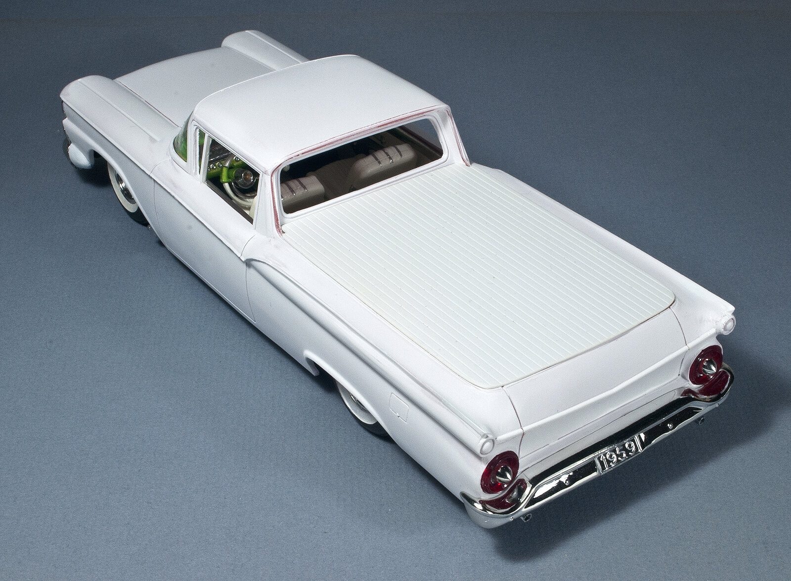 Thanks, Alan! This car started as a styrene toy version of PMC's Ranchero promo. The doors are longer on the '59 than the '57 because Revell based their '57 Ranchero on a four-door Country Squire wagon kit, so the doors are incorrect on the '57. On the real '57 Ranchero the door length is the same as the two-door wagon.