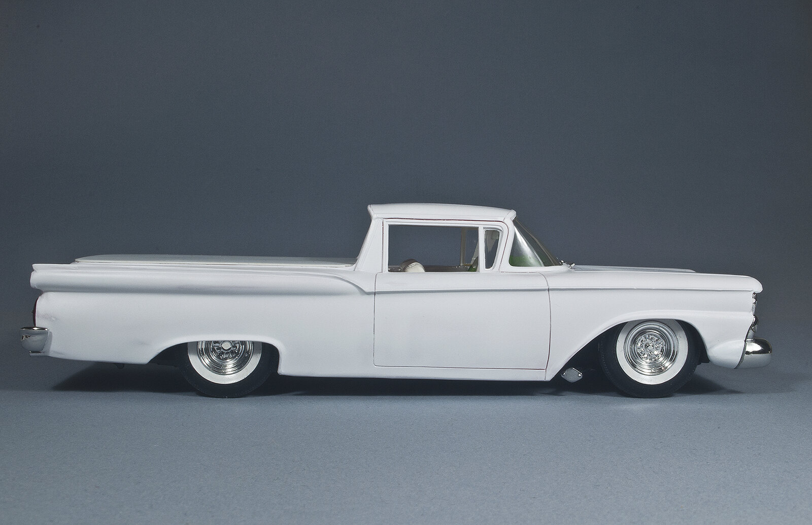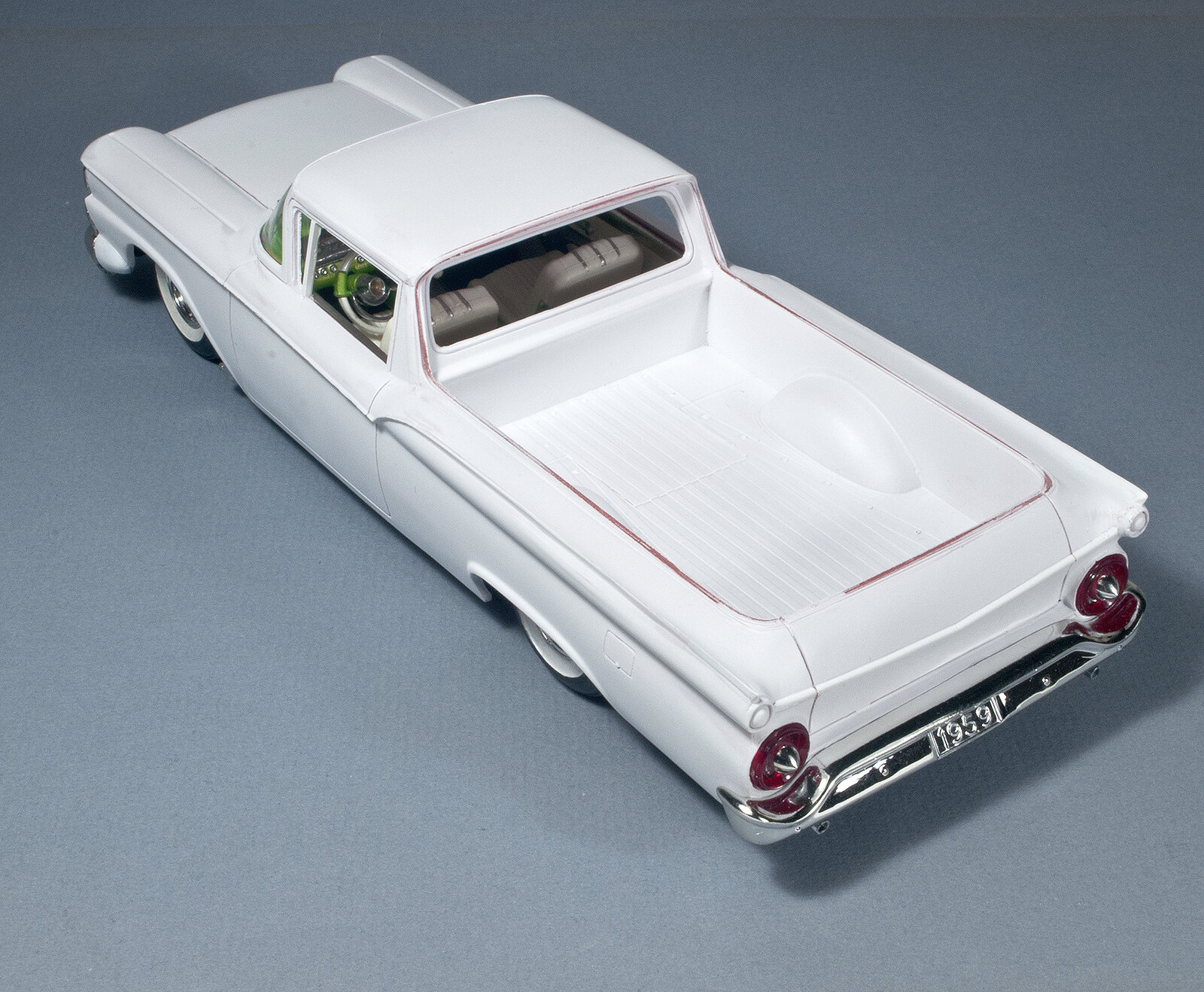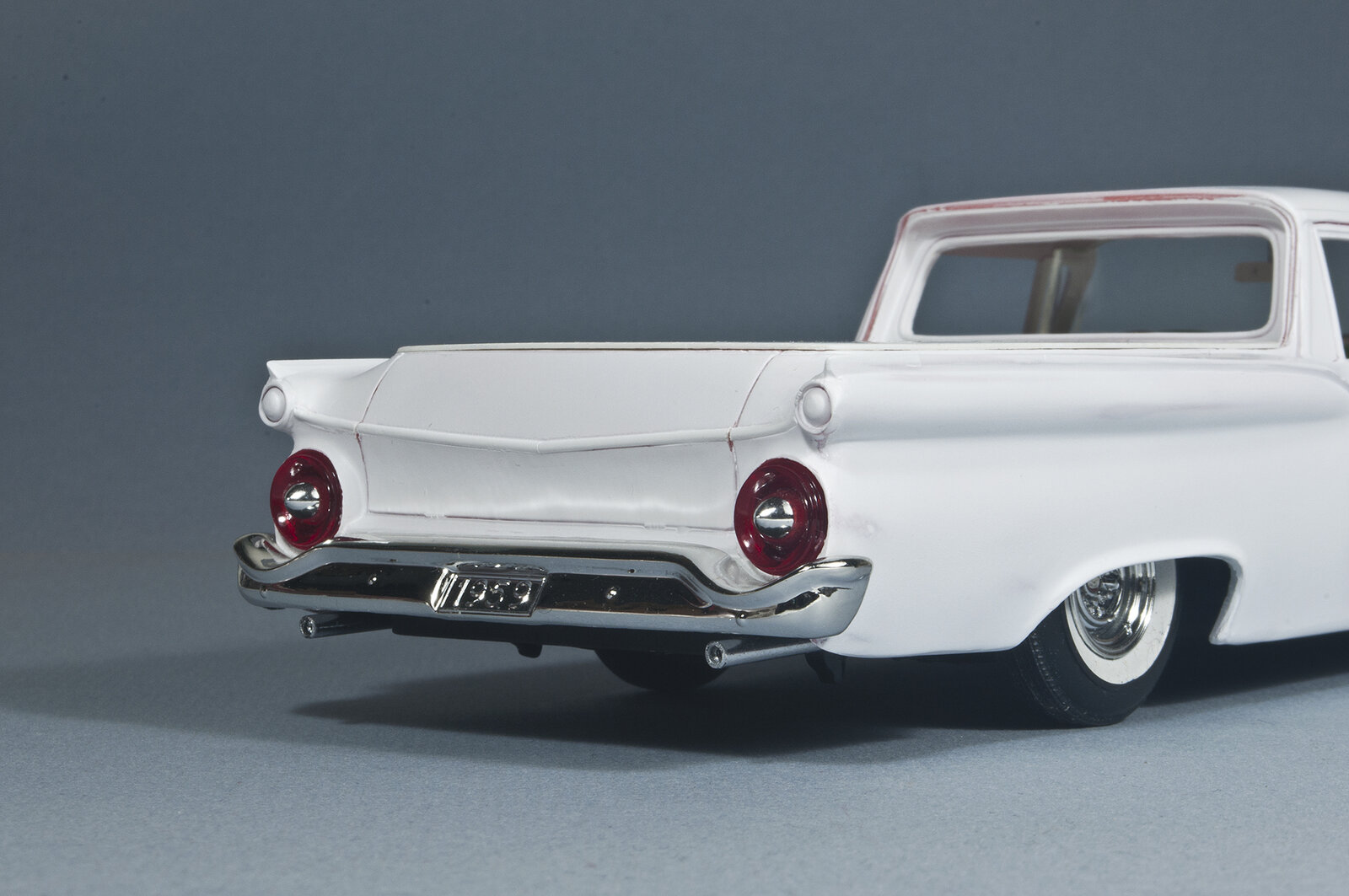 Thanks, Alan! This car started as a styrene toy version of PMC's Ranchero promo. The doors are longer on the '59 than the '57 because Revell based their '57 Ranchero on a four-door Country Squire wagon kit, so the doors are incorrect on the '57. On the real '57 Ranchero the door length is the same as the two-door wagon.