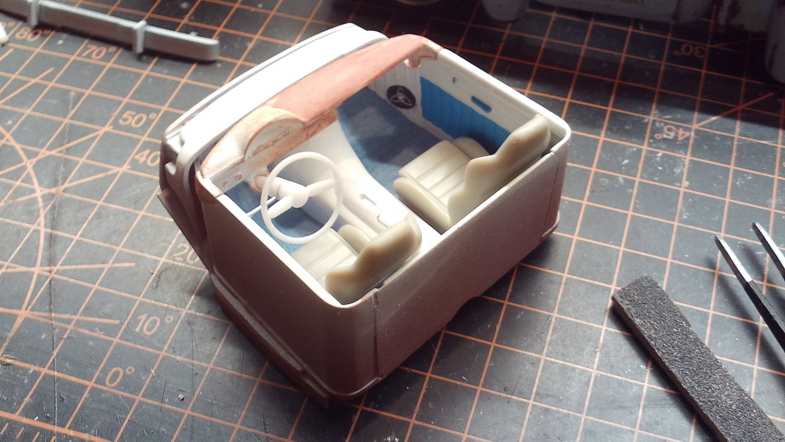 Sometimes small changes make a big difference. I painted the wheels and tires, and experimented with "salt" on the tire tread. My salt effects need some refinement, but I can see now that I can make it work. I used white un-sanded grout as my salt. I first applied a matte clear sealer with a brush, and then dabbed on (with another totally dry brush) the grout. Let dry and sanded off the excess. Presto, faux salt. I'll use a similar process for salt mist on the body & frame. got salt? Happy Sunday Modeling! David