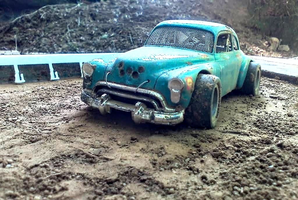 Has anyone tried baking soda....its got ki d of a sheen to it and it clumps up also I would think if you put some with water in a spray bottle ....mist on body area's let dry and it would leave residue behind keep going till you get the build up your looking for...when I have built dirt track race cars in the past I mixed up a little mud put a thin amount on a hard surface and just held the car down and rolled it through the mud several times at different speeds worked great of course you need live axles to do this....you could probably do the same with the baking soda.
