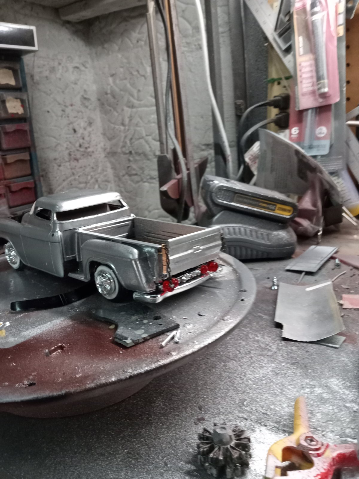 Mock up shots. Originally a 5 window kit converted to chopped roadster with salvage yard parts. Opened up hood sides with shaved molded handles replaced with single chrome handles. Stock bumper ends with custom center section/plate holder. 39 teardrop taillights. Flush skirts never again. The glue warped them at assembly. I'll use original Cal Custom candy blue with white top/running boards. Door cut. Gaposis yet to fill below top. Happy new Year!