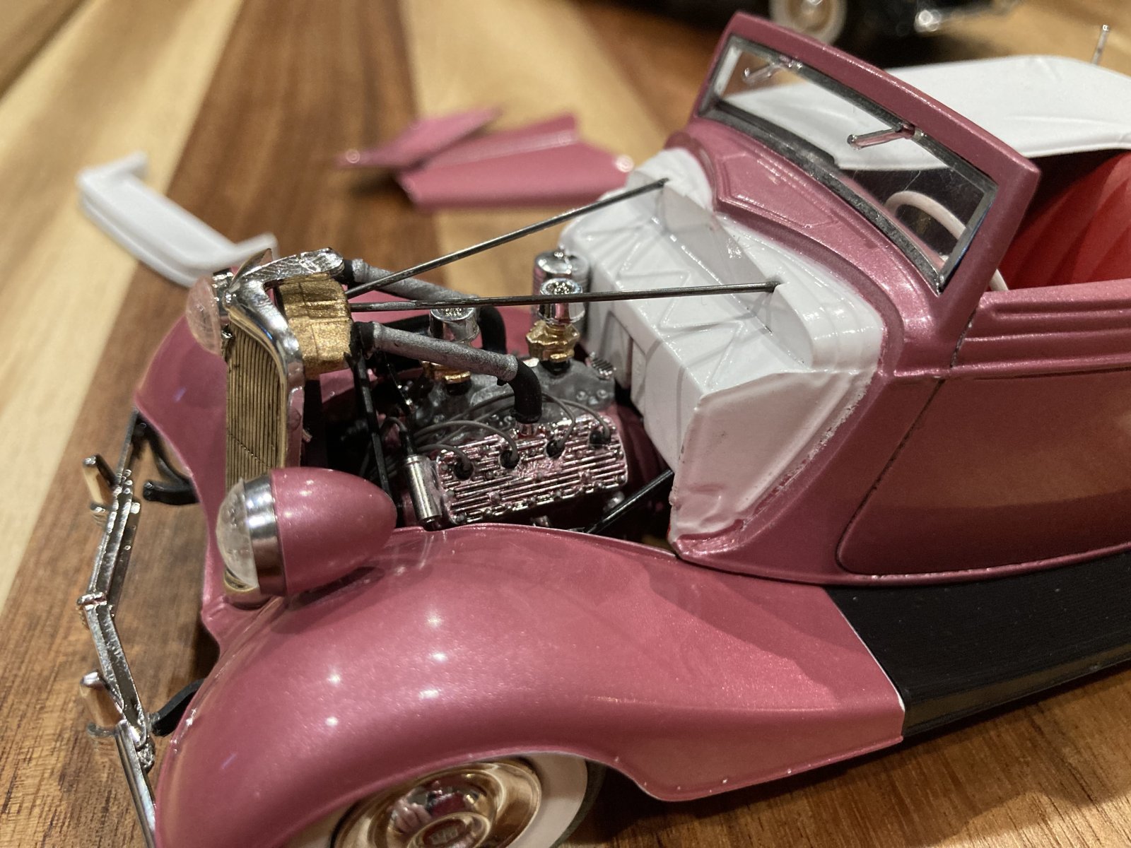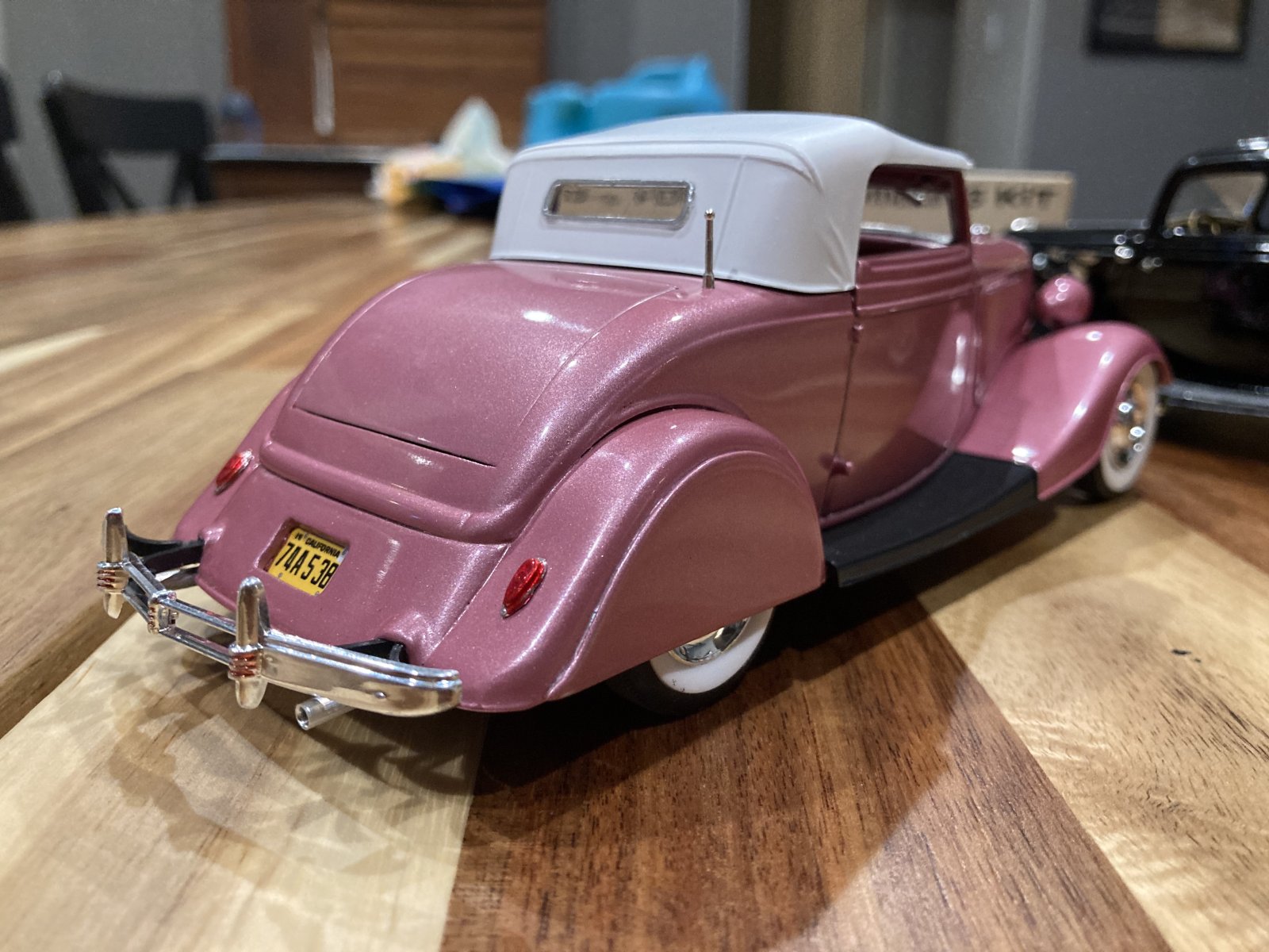 John, the fronts came from the Revell 40 Ford Convertible kit, the rears are a little smaller and from the 49 Mercury kit. I had all 4 from the Mercury kit but the fronts looked too small. The bigger tire and white wall filled the wheel opening better.