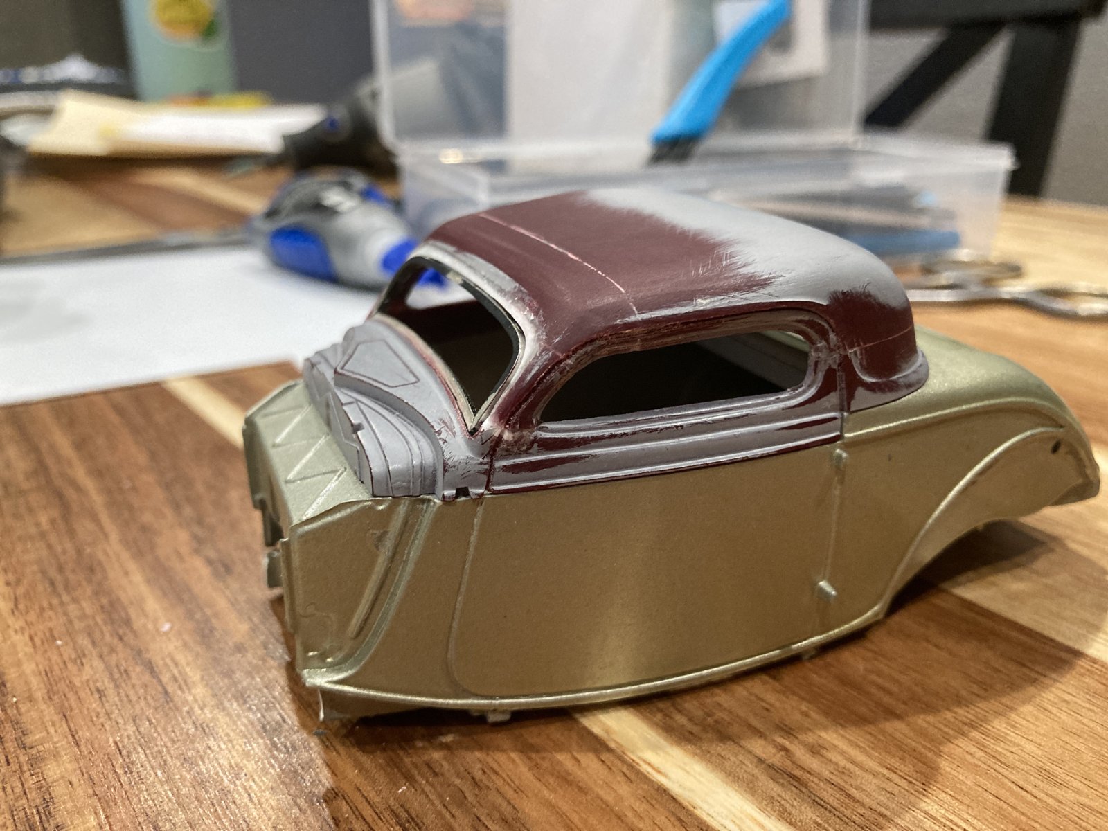 I did a “naked” group build using no paint, only sharpies and a chrome pen. Polished up the plastic and it looks cool! Monogram 30 Model A woody.