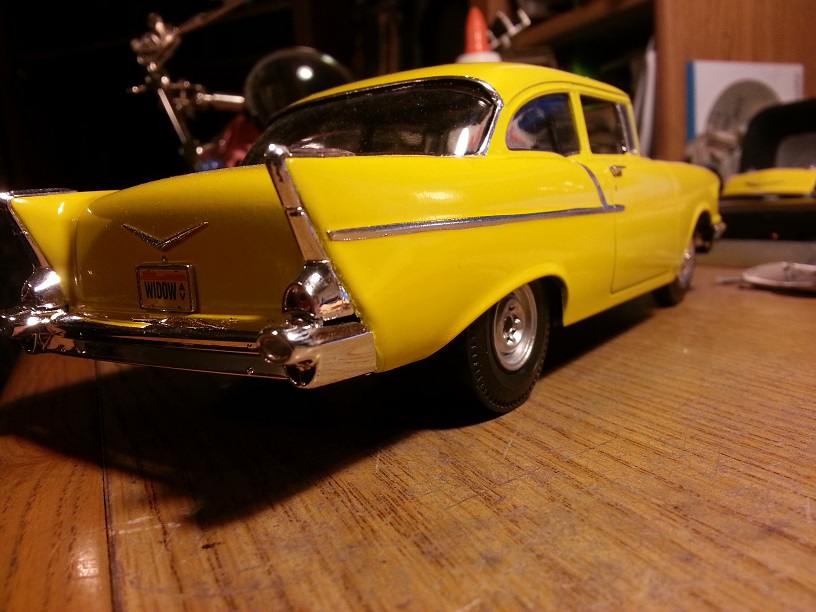 In 1962, my pal Johnny Dugan built a '57 Chevy Bel Air model, (AMT or Revell? can't remember) Entered it in the Town & Country model show in San Jose, the model won all awards. Flawless build, as is your yellow '57. Amazing.