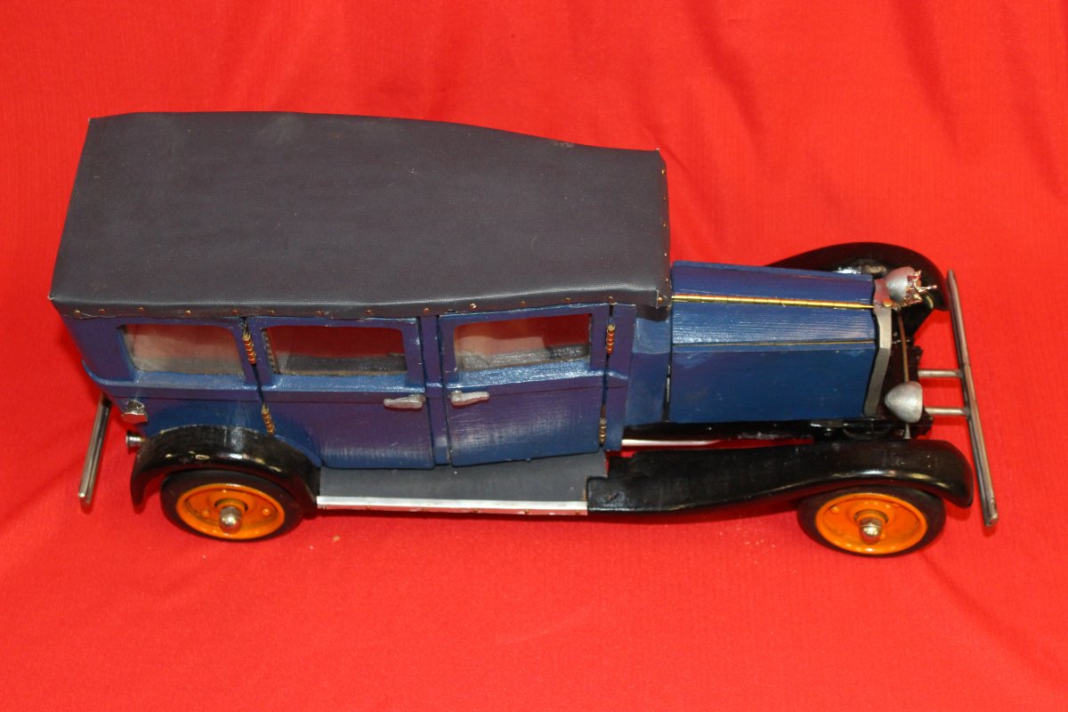 I don't know where my text went..... but as you can see this is scratch built that I started back in 1984. It started with the wheels that are industrial roller about 3" in dia. Its not a model of any particular car but a prototype of a "DeBorde 8 Super Touring Sedan model M" (me). I cast the radiator, headlights and door handles from zinc. The bumpers are stainless wire, the hood ornament is a charm, the taillight is a grease fitting, the gas filler is a oil cup, the body and fenders are wood. The car is about 18" long