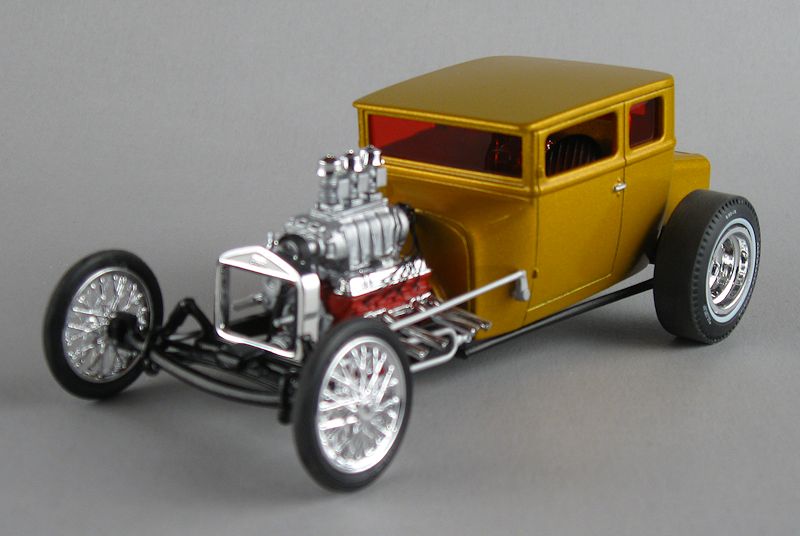 Nice find, AlphabetSoup! That's the 1960 re-issue of AMT's '32 roadster, which was initially released in 1959. The '60 release added an opening rumble seat, luggage rack and dual sidemount spare tires. Also different from the first issue are the headers for the Chrysler engine the '59 issue had zoomie-style pipes rather than your kit's curved headers with the optional megaphones. In the '60 issue the optional blower for the Chrysler got injectors whereas in the '59 issue the tri-carbs would simply be attached to the blower. The most subtle difference between the '59 and '60 issues is the lack of valve cover bolts on the Chrysler engine in the '59 kit. Here's a parts-box AMT '32 I built a few years ago. This one has the '59-issue valve covers and blower (the tri-carbs are from AMT's '40 Ford kit), along with miscellaneous parts from other kits, and later issues of the '32... The roadster in the shot below is a '59-issue '32. You can see the difference in the headers. Note that this kit had red,black and white flames while yours has red, black and yellow. I think it was the luck of the draw as to which color you got in '59 or '60, as both color combos can be found on each issue, though the box art in '59 shows yellow, while the '60 shows white. And, yes, my mind is a repository of useless model kit trivia...
