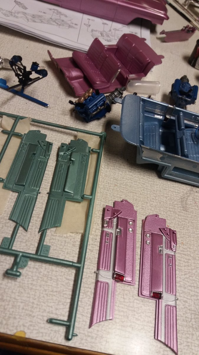 It was Cadillac Sunday at my bunker today. Working on four of the Monogram '59 Eldorado Seville's currently. First one is painted in '59 Oldsmobile "Burgundy Mist"/'59 Buick "Lido Lavender". Clearcoat on the lower body, matt varnish on the roof to match the vinyl-roof texture. The other two are actual '59 Cadillac "Hampton Green" and "Persian Sand". All automotive acrylic lacquer base-/clearcoat -System airbrushed by Yours Truly. The fourth one in white primer will be blue eventually.