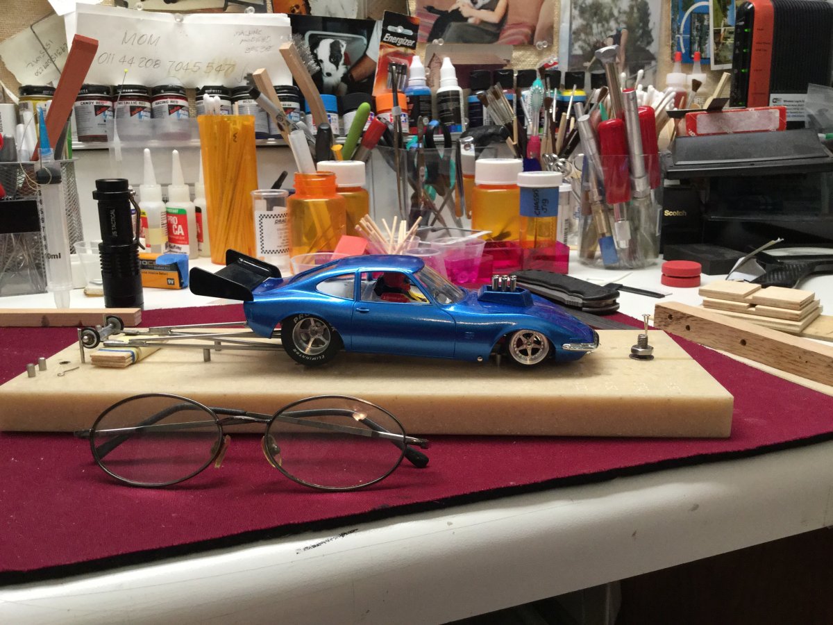 Here's my submission, Ed Roth's Outlaw... I painted it years ago, just finished it yesterday 'cause it was too damn hot outside! The '29 A pickup was an older 2 day build, and you can see a '48 Ford convertible in the background with an Olds grille waiting for a chopped top and Carson top.