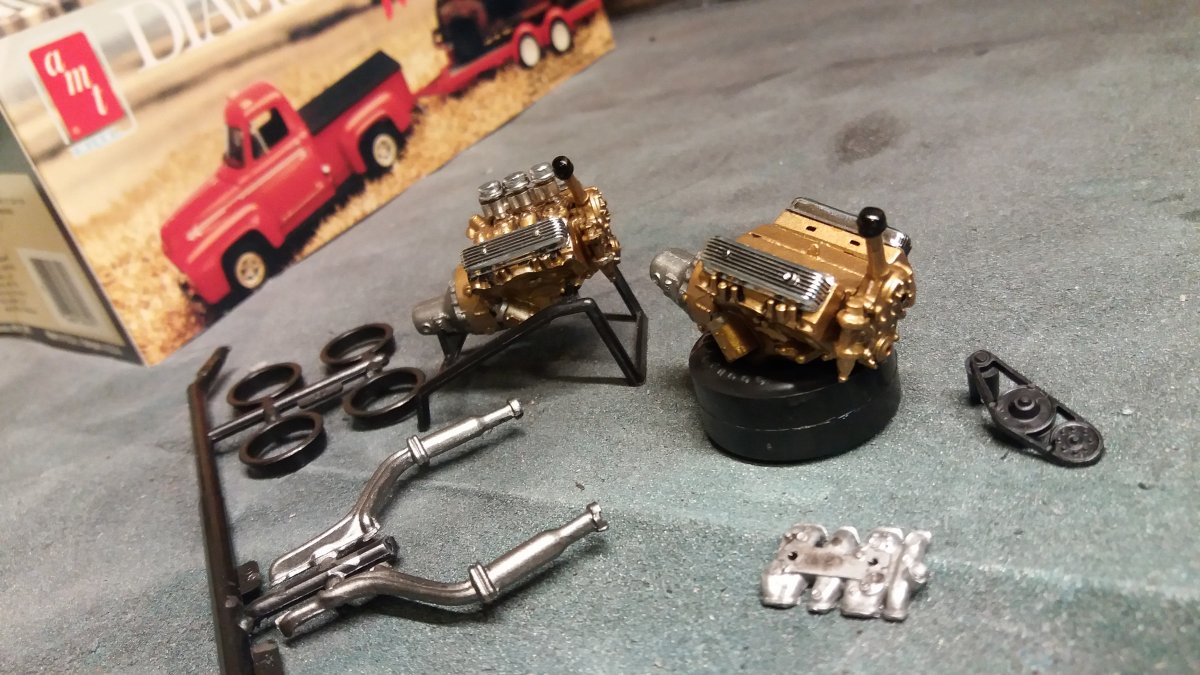 Good work, everyone! Here's the latest of my progress. An AMT '59 ElCamino "work truck", finished in '58 Chevrolet Silver Blue/Fathom Blue 2-stage automotive acrylic lacquer. Red primer "sponge-brushed" on the bed floor, w/ a mixed assortment of hand-tools out of the AMT '53 F100 and '63 Impala -kits glued on. The wheels and poverty-caps are out of the AMT '56 Crown Vic, a good bit deeper dish than the ones in this kit to afford a fatter tire, as this one will be a drag-car tow rig.