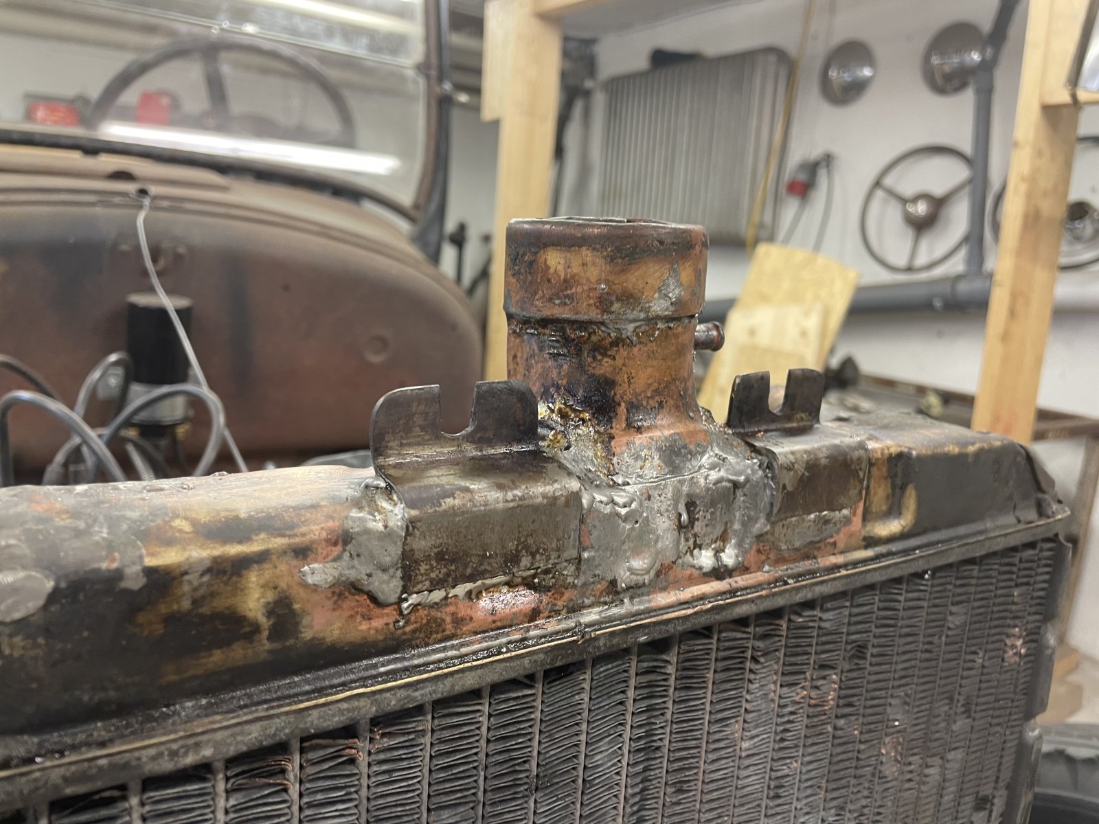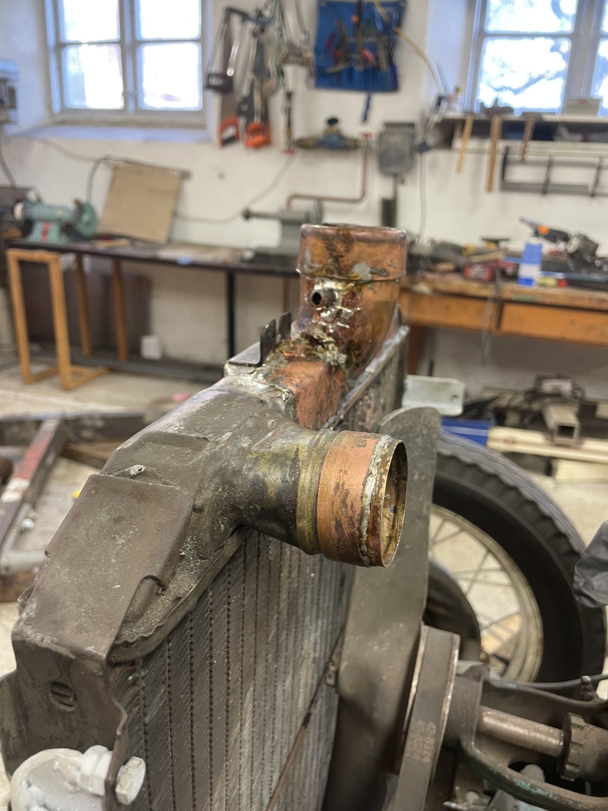 6D8D16B0-D8F0-4317-AA1E-255D7F75BAEE.jpeg 0037D0C2-B73D-487B-87C3-4043819F8ACE.jpeg C661265D-38AE-4104-9E65-AEE3C7C207B3.jpeg 7981F58E-4671-487E-85C3-78F96221FDDB.jpeg 511F8F38-9BF0-4255-B646-E51BDDC0C920.jpeg 3AD27494-FB99-4B64-A402-6392A8641455.jpeg 44D2BBCD-E1B1-4CD8-86A0-A66DE82FDDAE.jpeg 89A4EAC6-A6DB-48C9-AAF7-EEBDCF68490B.jpeg 2D5EC685-E652-4D46-9BE5-C5F66E49BB34.jpeg I found a cheap -65 or so Mustang radiator that I will try to modify to fit the -30 shell and banger. The radiator sitts better upside down in the shell, and then also get the lower inlet on the correct side. So without any experience I will try to solder a filler in the bottom and cover the old filler neck hole.