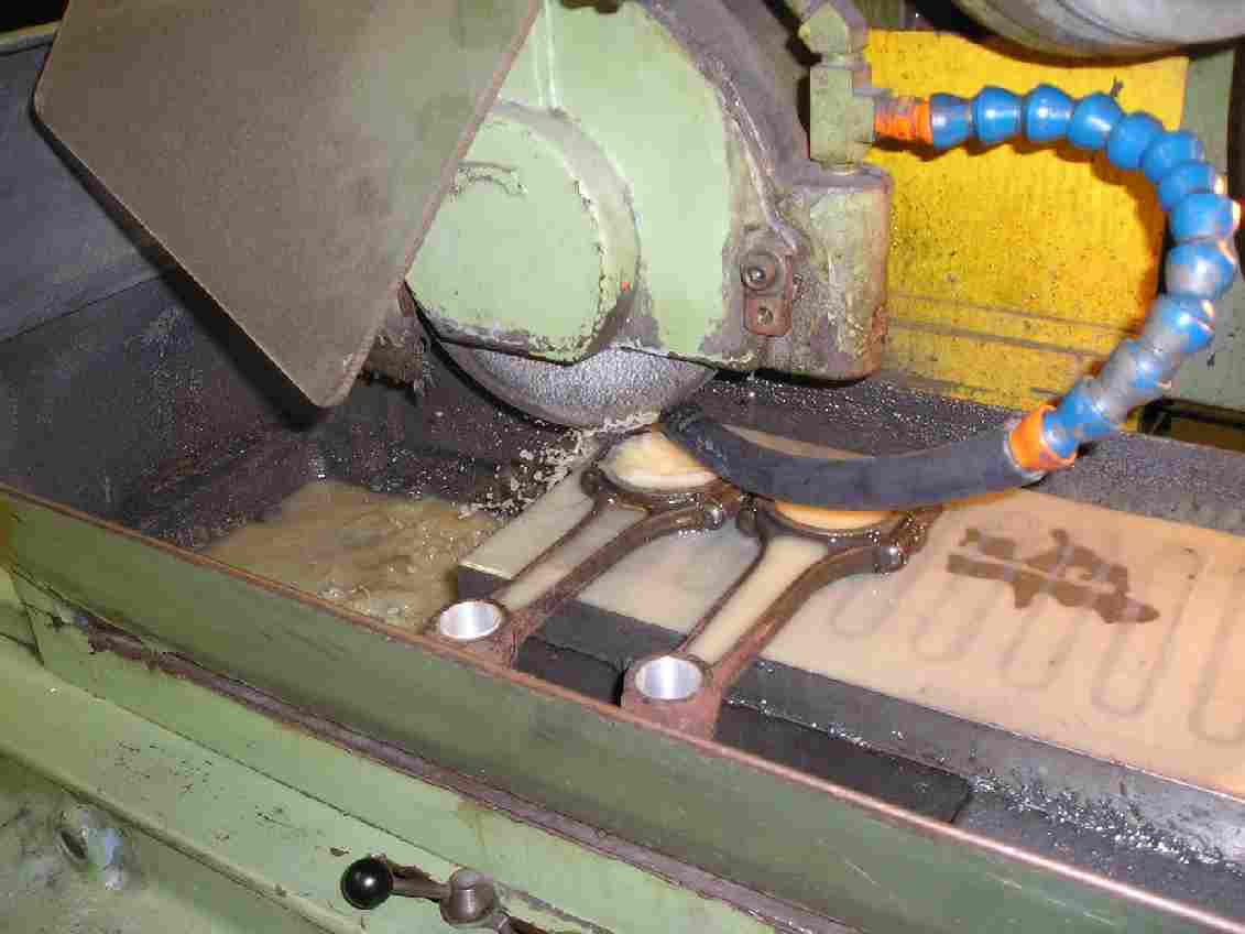 What's the best way to remove .028 from a connecting rod you ask? With a surface grinder. All good machine shops should have one. I was able to use the one at the school where my Dad used to work. If you're not familier with a surface grinder, it's a very percision grinder that uses a magnetic vise. It is made to grind things perfectally flat. The wheel moves up and down, and the table moves left and right, and in and out. This particulat grinder is accurate down to .0001"(one ten thousandth). Make a pass or too, take the rods off and try them. You DON'T want to take to much off. Grind the same amount off of each side of the rod. You might have to re-chamfer the side of the rod that goes against the crank web.