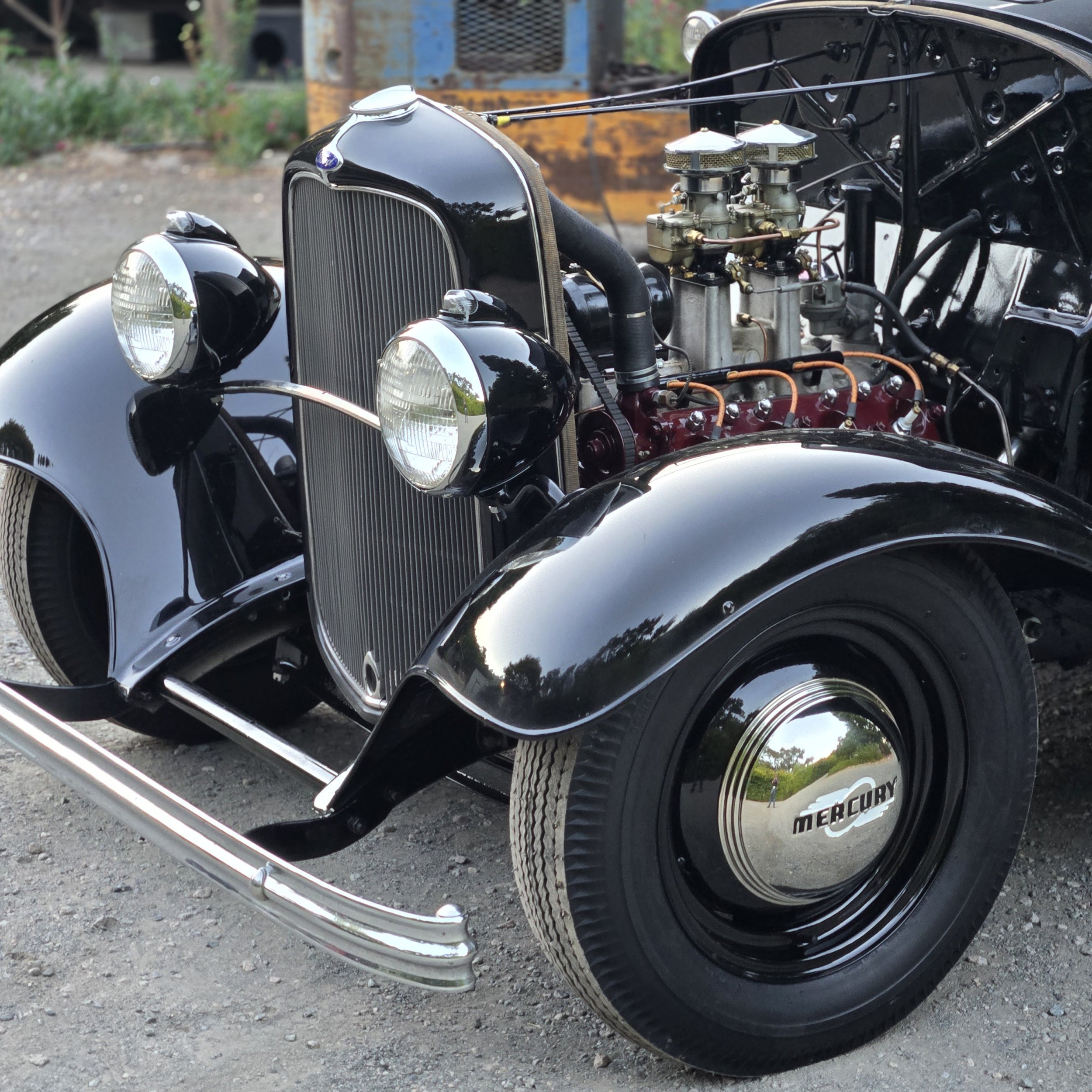 I dropped the car off with Tom Sewell yesterday morning for the new top insert. And picked the car up at the end of the day, with a new top. I did need to finish screwing down the tack strip and putting in the rubber cord It was too late last night to get pics, so I rolled it outside this morning before heading to work This phase of improvements is almost a wrap. Here's the list: Repaired/replaced broken front crossmember with 1" drop center grafted into original 32 crossmember, retaining the stock motor mounts. Replaced dropped Mosel A axle with dropped 32 axle Replaced leaning original spring with aftermarket reverse eye spring. Went from 7 leaves to 9 to gain a little suspension travel. With the dropped crossmember the car still sits a bit lower. Went from 40 Ford brakes and drums to original 41 Lincoln backing plates and drums. The 32 axle was a little wider drop than the Model A, but the pancake style drums narrowed up the track width, centering the front tires nicely in the fenders. Dropped the tierod for crank pulley clearance due to the dropped crossmember Upgraded to new Rotoshim shock absorbers with shorty shock links Powdercoated frontend plus bumper irons (went to shorty rear irons) and speader bar. Removed horn, front license plate/bracket, cowl lights and greyhound radiator cap. Changed headlights from chrome BLC 903's to painted 682-C's. Wheels changed from maroon Kelsey Hayes wires to 40-48 Ford disc wheels, powder coated black with 47/48 Merc hubcaps. 16x4 front, 16x4-1/2 rear, still with 5.50 and 7.50 Firestones. New top insert, replacing the old Hide-em trim strip with an aluminum tack strip bent to fit. That's about it for this round, but this car has been a continuous improvement project over the last 13 years, so I'm sure there will be more changes in the future. They are never done!