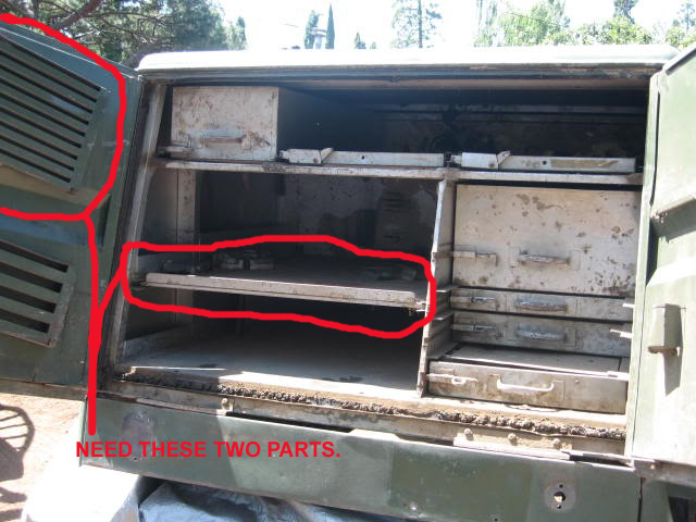 Thank you for the offer to look. all I need is the two items that are in the photo that I Posted that are circled. My utility box is made by Highway trailer company and it is a type IU-76 The main piece I would really like to try to find is the rack that goes on the upper part of the back door that is circled in the photo. If you could take pictures of this utility box if you find these parts I would really appreciate it even if you use your cell phone to take the photo or if you want you can give me a junkyards phone number and I will deal with them If they have these parts.