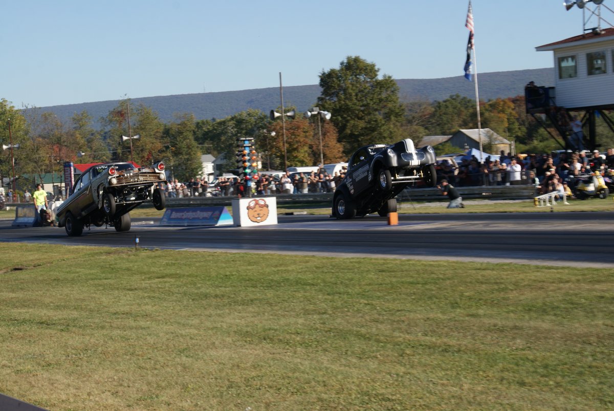 There's nothing like seeing air under the front wheels. I like the dragsters and rails just smoking the snot outta the tires and have the front end flying.....MARK