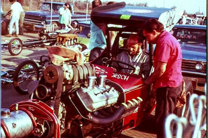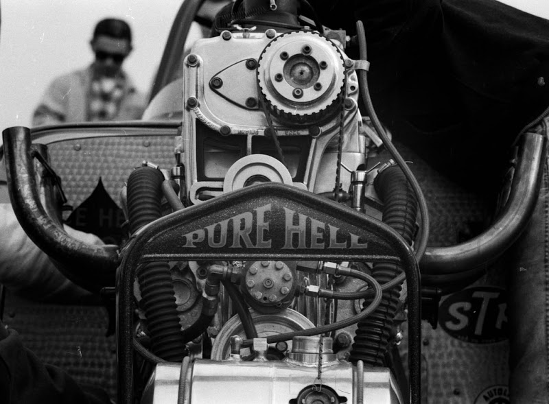 nice Lots of little details to study and copy for somebody building a period car - like steering wheel, motor mounting, those wild church organ zoomies, friction shocks. I don't recognise that car - any info on the owner/driver? It looks like it may be at the old Dragway 42?