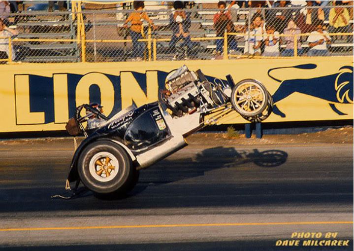 Yep, with modern tires and sticky tracks having the motor further out can be a good thing. I was talking altereds with long time fuel altered shoe Howard Haight on Wednesday and he mentioned that the Fiat that he drove a couple of years back had the motor only about 55" out and due to that it was prone to wheelstanding (at half track when he shifted). That said, at the time that the photo of Burgin's car was taken things were in transition and most altereds were at the mandated maximum 25% while that car was built for the 10% /SR rule. Yes, it was capable of carrying the front wheels but it was not as quick as a true altered would have been with the same power. Roo