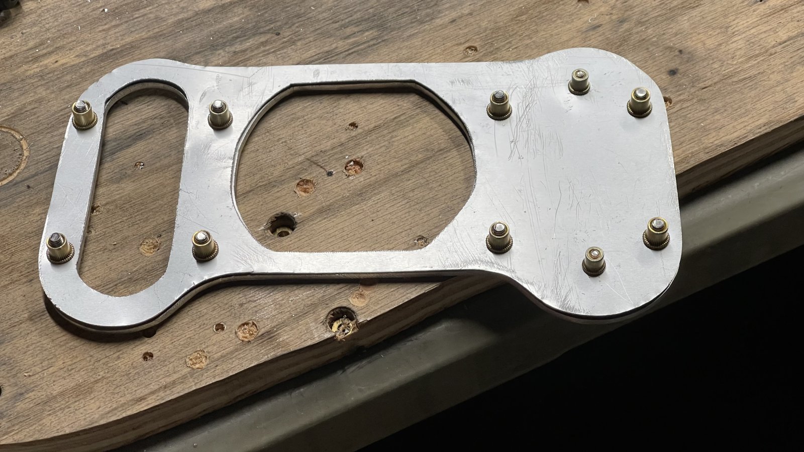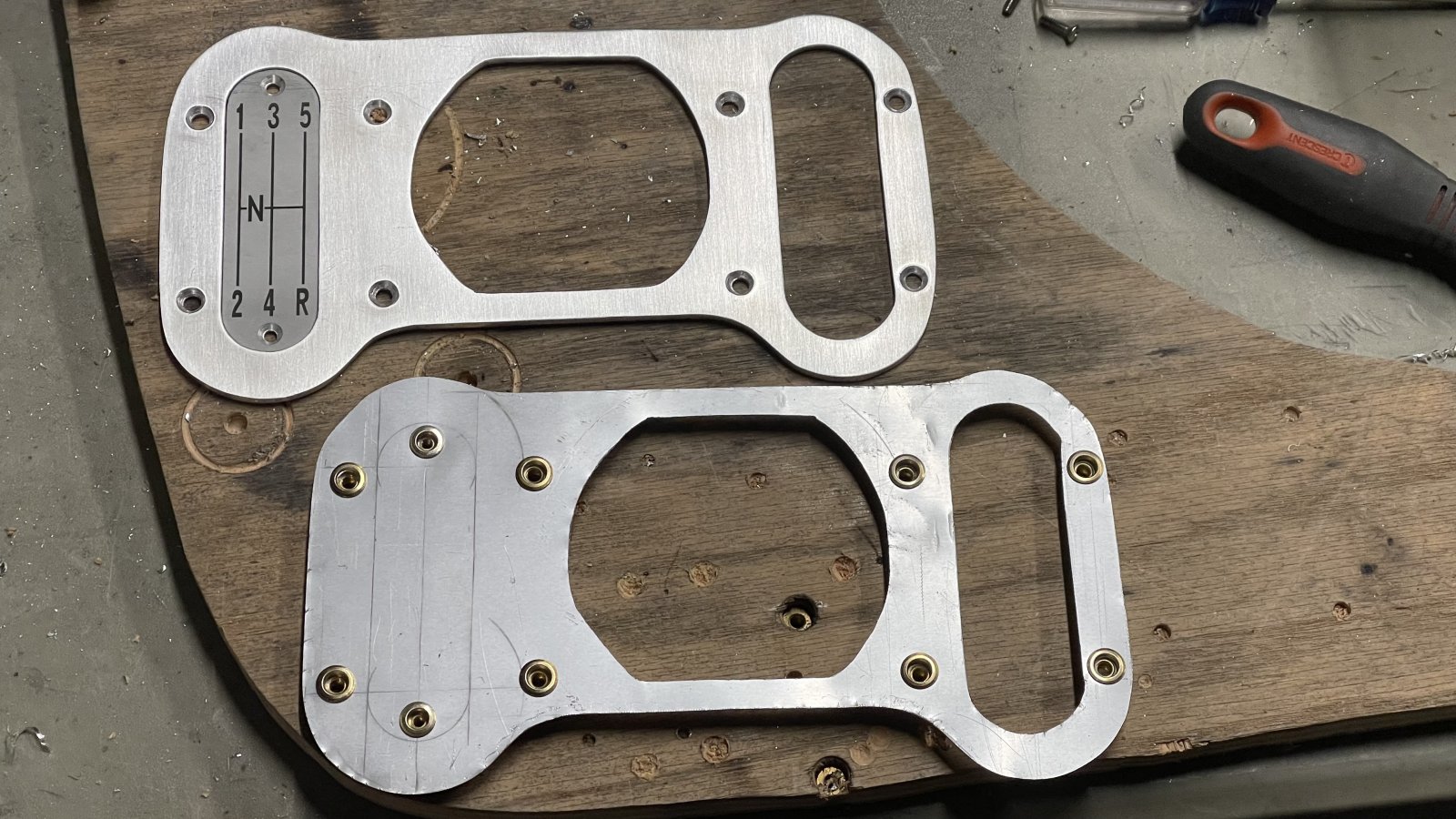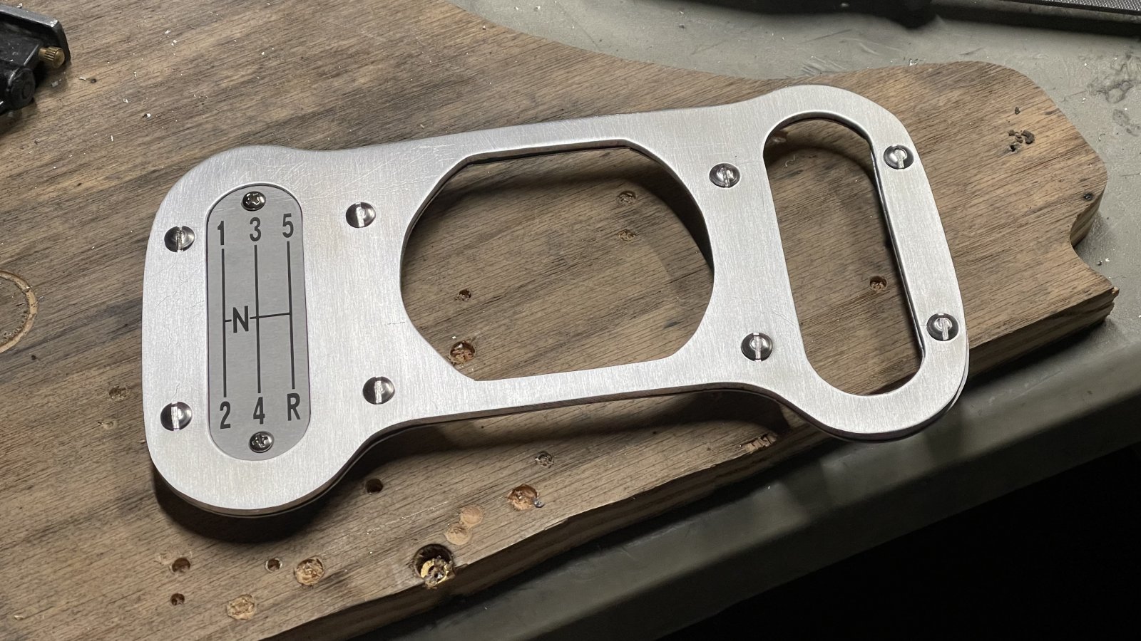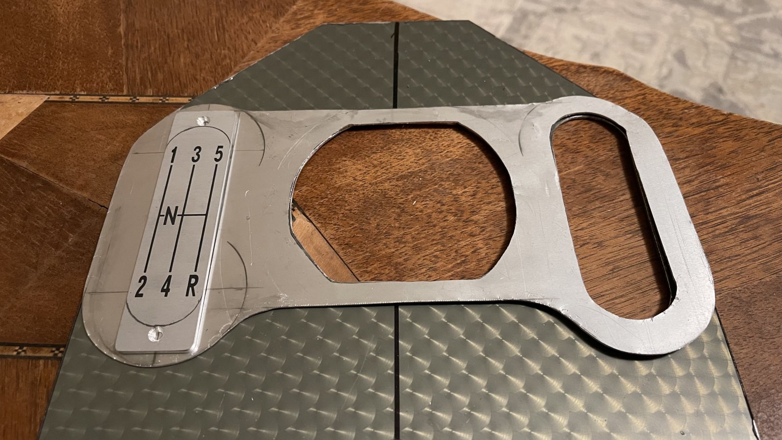 Today I took the old insert panel and cut it down to put in riv-nuts. This will sandwich the shifter boot and emergency brake handle boot underneath the panel and help hold things together. I also cut a bezel out of 1/8” aluminum and fit the H-pattern tag. Once I have more time, I’ll drill the holes through, round all the edges on the bezel, and polish. The tag is 1/16” thick, so it will be recessed in the bezel and should look pretty cool.