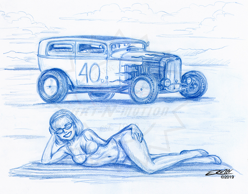 Drawing roadsters in class for the El Mirage Races and Bonneville is difficult, since the styles differ. The standard full bodied roadsters are the winners in the original concept for using old hot rods modified to race. But, in taking a hot rod 27 T-roadster and converting it to a drag car, then modifying it to a semi streamline body style is a work in progress. Here is one concept for faster speeds with a few streamlining and body changes.