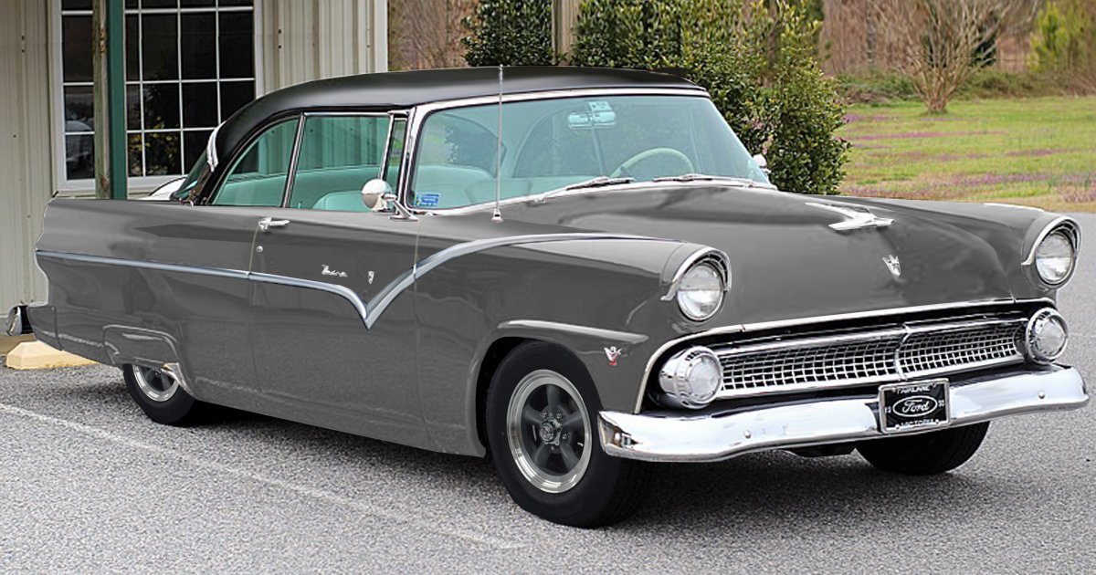 Hi guys, you have been so helpful in the past, wondering if you could work your magic again. My 55 is the same color combo as this, wondering if you could do a gunmetal Grey on it with a black satin roof and some darker grey TTO style wheels? I want it lowered 2” or so and satin/ nickel the side trim. Just a fun cruiser. Thank you for any help![​IMG]