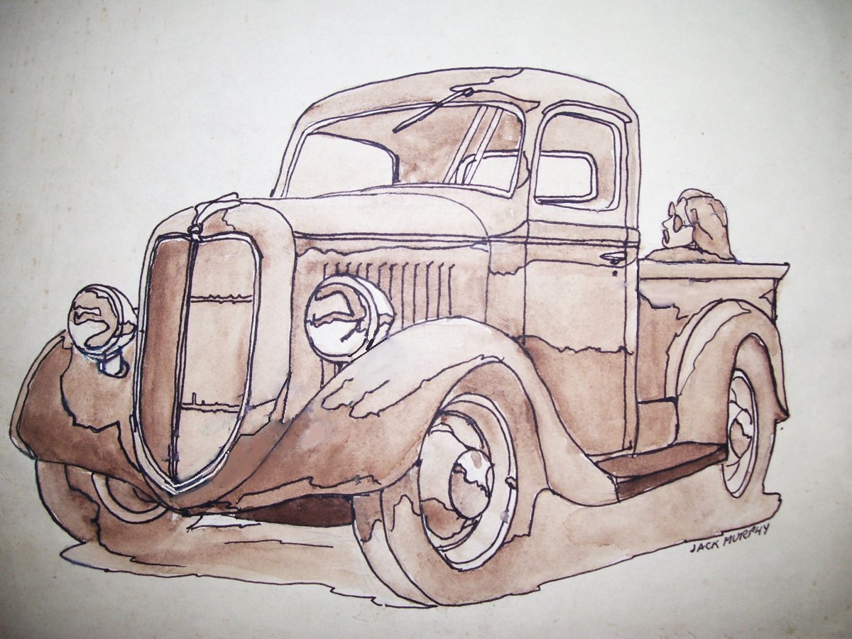 Anyway, I also did this self portrait back college of me and my '35 Ford PU which I drove (when it ran) all through college . Unfortunately it got some water damage over the years...don't know if it can be cleaned up...thought I would post it here and see if anyone can do anything to repair/improve it.