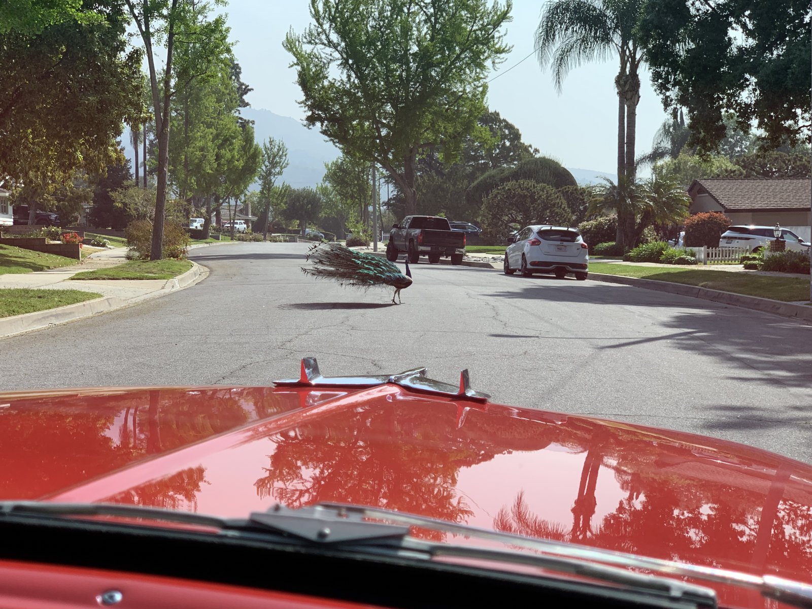 This is an everyday occurrence at my house. My hobby is cars and my wife’s is birds and we have lots of peacocks. :D