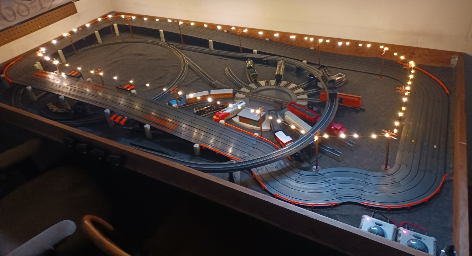 Man that is a cool setup ! Ive got all my Pops old Lionel and AF trains as well as his slot cars and some old RC stuff too. Have a nice insulated shed out back Ive been wanting to set them all up and enjoy w my son. Id never thought of doing both train and slot car tracks on the same platform, thats perfect ! Thanks for sharing !