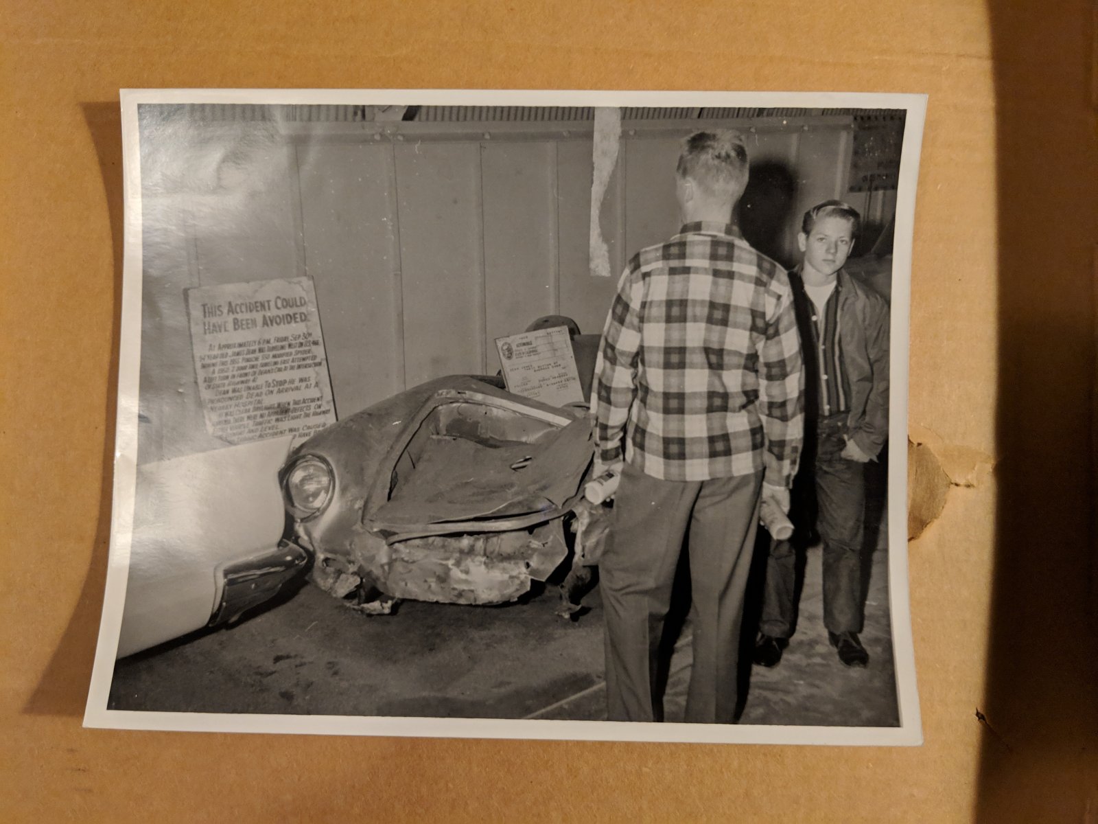 You are correct, it was a Business Coupe, although the CHP accident report erroneously called it a Tudor. The trim was from a '55 Pontiac. You're the first person I've seen who wondered what happened to Don's Ford. Given the extent of damage, and Don's statement he salvaged some engine components, my professional opinion is his insurance totaled it and it was sold for junk. It probably went to a local wrecking yard in or around Bakersfield. Being barely five years old, what was left probably found a ready home and the leftovers soon went to the crusher once all the good stuff was sold off. Remember when everyone was making all kinds of "what ifs" about D.B. Cooper? What if some souvenir hunter bought the wreck from Don't insurance auction and hid it away in a secret garage...