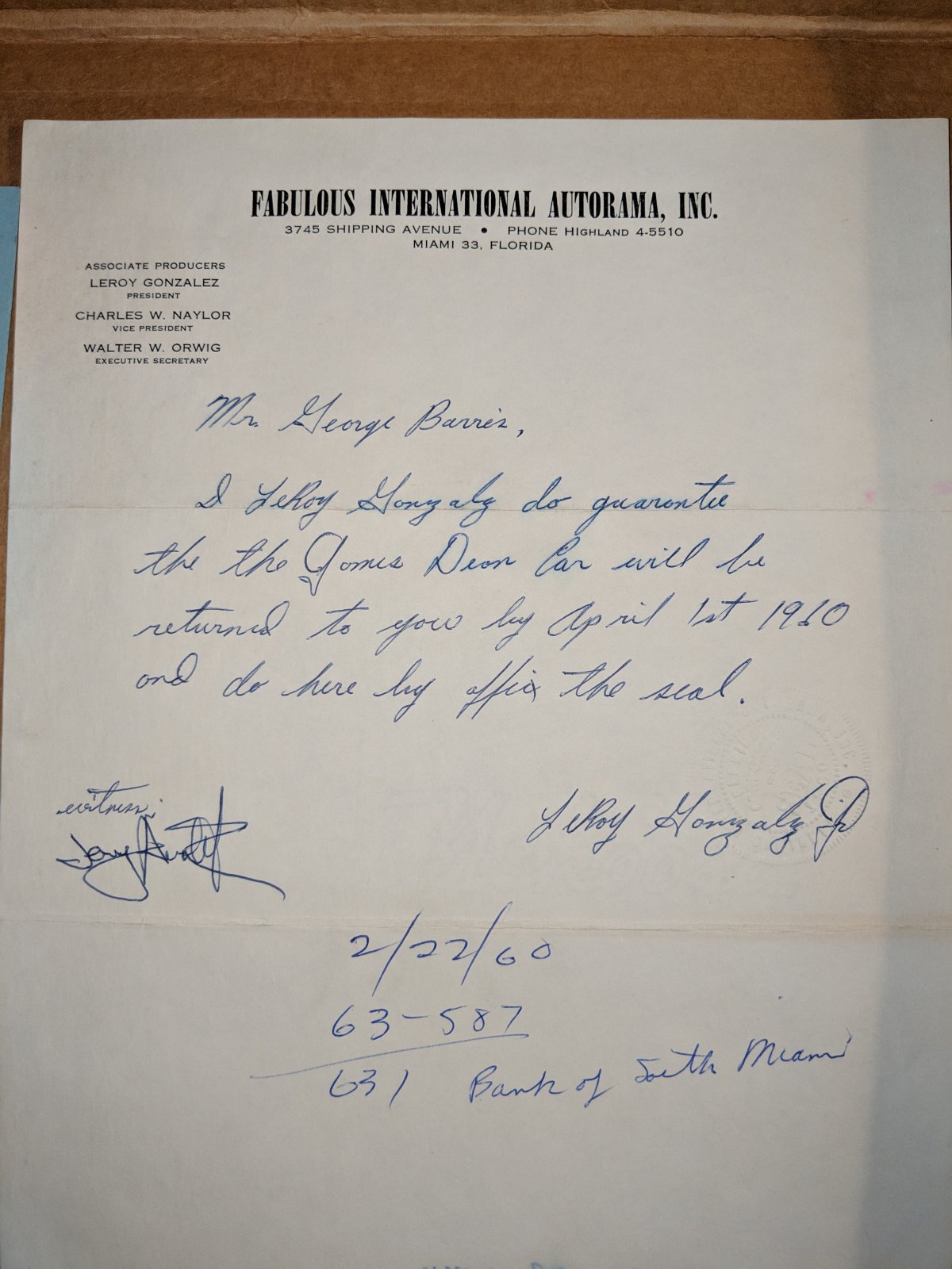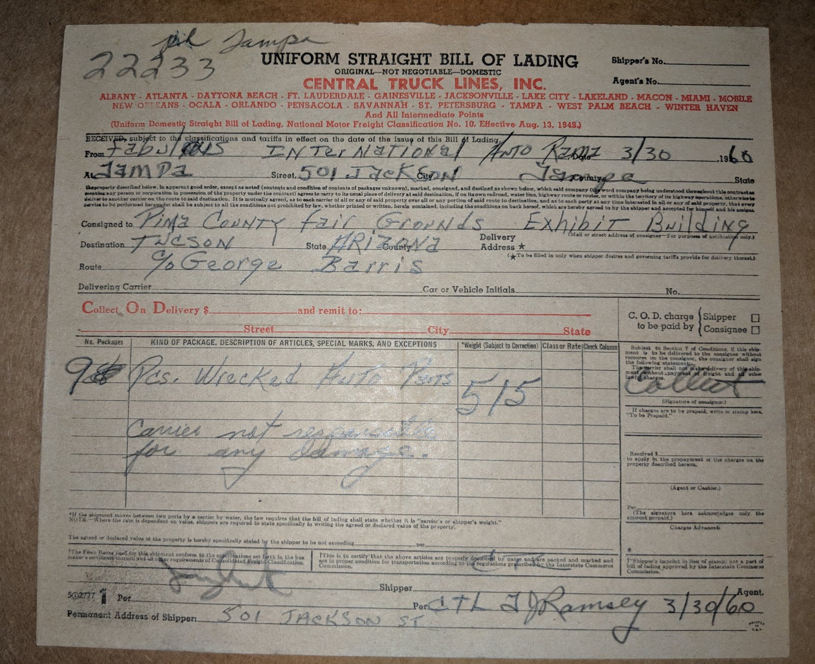 I’m not gonna clog up the board with this stuff because I’m not a regular contributor anymore! It was my understanding that Barris could not insure the wreckage because it was just that, it was 4 or 5 pieces or the wreckage that was toured around! Shipping companies were used as the transport services for the remaining parts of the car! When I was with Masterson and we were doing the shop I asked Dean Jeffries a bunch of info on the day he striped “little Bastard” on the car! That was right before Dean headed north . I’m gonna show you another couple of documents This is clearly the shipping manifesto for the Dean Car as it was Leaving Florida for Arizona and another letter regarding the car! I will also dig out some letters from Leroy that he sent from Havana Cuba which was where he went to after he lost the money on the Auto Show venture! The dates on that invoice clearly line up with the dates of the transportation conspiracy! It is my belief that the car was shipped from Florida and someone knows why it never arrived in Arizon. George has always said that someone stole the car and I’ve heard countless rumors and things that aren’t factual about the story behind the car. im still very heavily into the history or hot rodding and Kustom car building and I have spent the last ten years buying up collections and doing research on key cars and key people from these eras. I still do Kustom work and I’m a metal fabricator/designer/welder by trade. My money is just made working with engineering companies and building other things other than cars. Conveyor systems and pipelines pay my bills! I own ELNAH Fabrication out of Nebraska and Iowa and I have a contract with Tyson Foods and a Eobotica company out of Canada. I’m waiting on my best friend, Brad to get better and clean his life up and then I’m gonna see if he wants to make another run at building a winner.. I miss it all, but my passion has turned to collecting and contacting people and visiting with them! we had a lot of fun fucking around here in the early days. I’m just not the same fuck up that I used to be! xoxoxoxo Germ