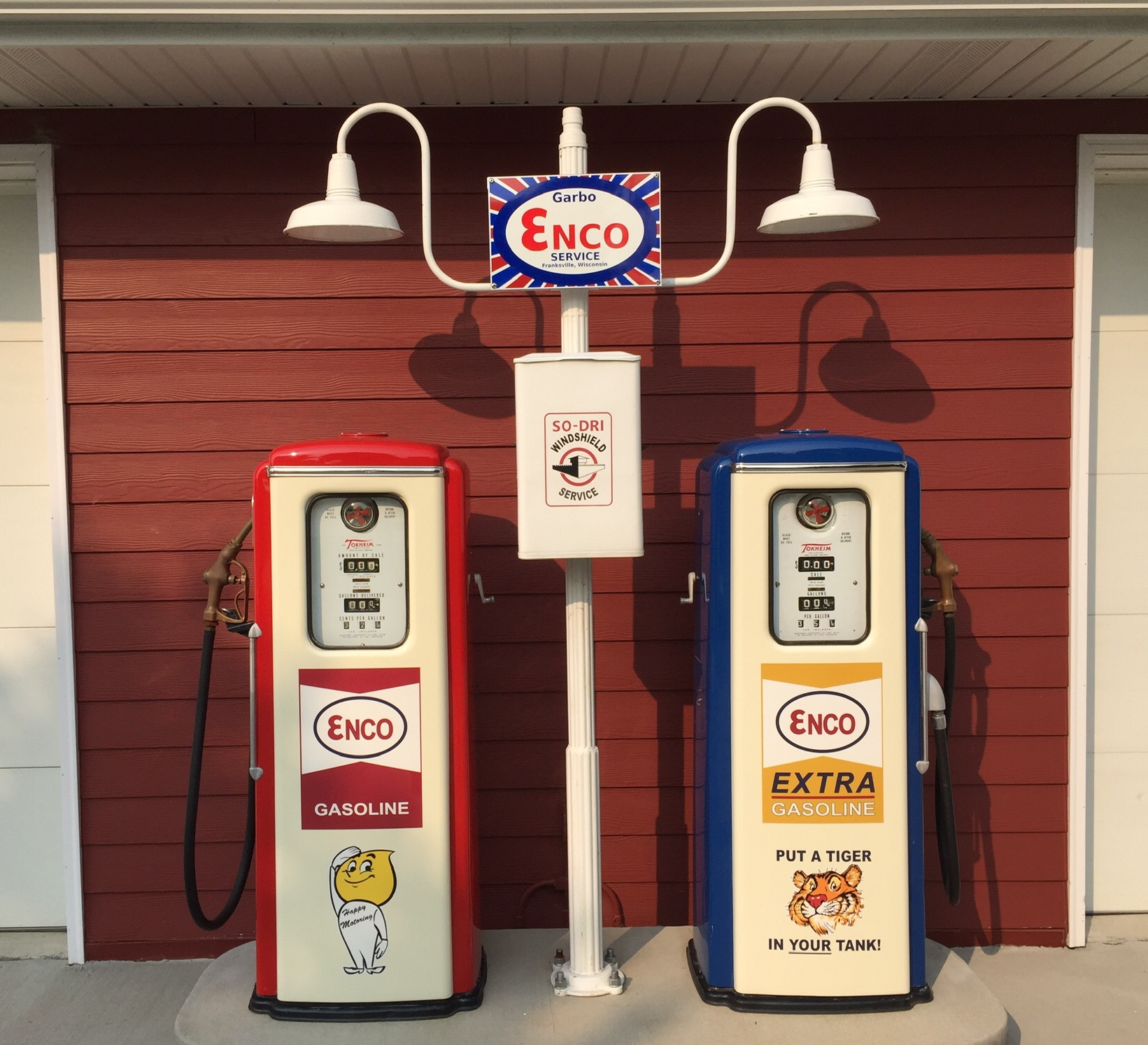 I have a few I restored and two more that I am working on. I keep my Mobilgas Special inside my shop and my two ENCO Pumps on an island in front of my shop. I will be doing the next two in local brands, Wisco 99 and Pugh Oil Co.