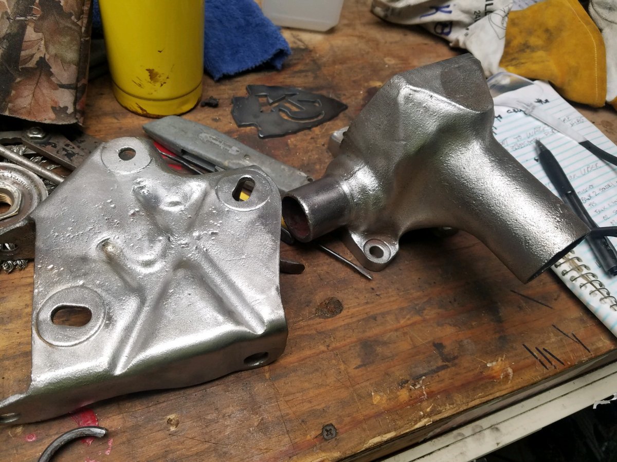 Alright steering box bracket all cleaned up, box empty and all cleaned up! Gonna throw some primer and paint on them while it’s warm out in the next few days. Still need to weld on some spacers to the bracket but I need to have it all mocked up and on the frame before I can check them. The bottom flange just hangs below the frame a little, not enough to justify sectioning the entire bracket but it will take a little spacer. Want to weld them in place because if it ever had to come off the car while****embled it would be a pain in the**** to wedge the spacer in and then try to get the bolt threw it all.