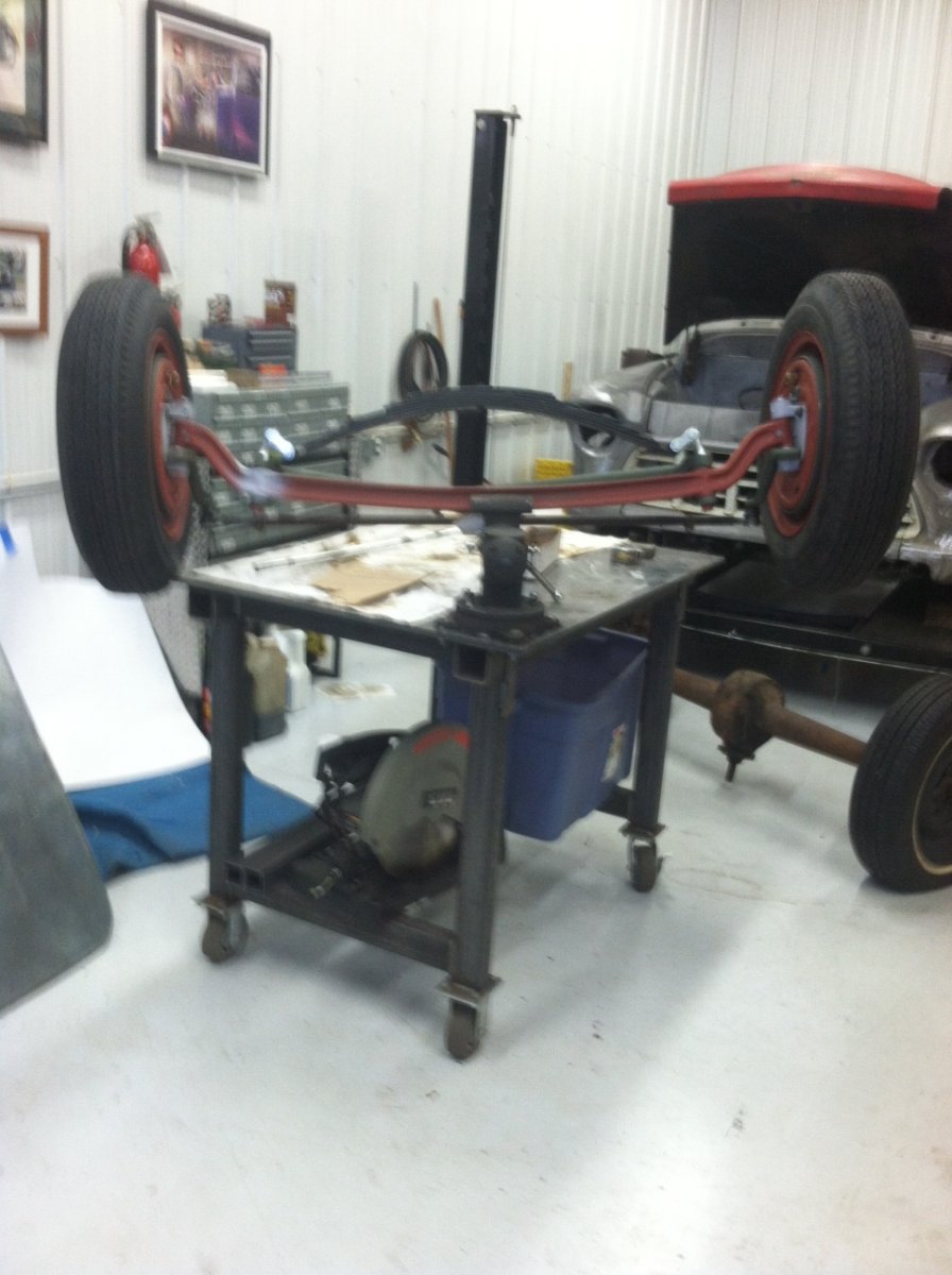 I'm pretty tight on space so this is what I ended up doing. Worked out really well. Kept everything off the ground enough to work on and is very easy to move as a unit so I can work on one end or the other. Got the spindles/king pins/ lower shock mounts on as well as the backing plates and main leaf. Hoping for not only a roller tomorrow but one with drive train mocked up in it! I'll make a fresh pot of coffee in the morning and see what happens As an aside I didn't clean and paint the backing plates because 1: they still have hardware on them and it'll be handy to give them a look when they get rebuilt later 2: I think I ran out of paint drying outside weather for the year :/ Plan is to wire brush the hubs and install new race/seals/bearings and slide them on. I'll stick the ring adapter on and put my front wheels then with out the drum because I don't yet have the spacer required to clear the drums. Any how kinda rambling. More tomorrow