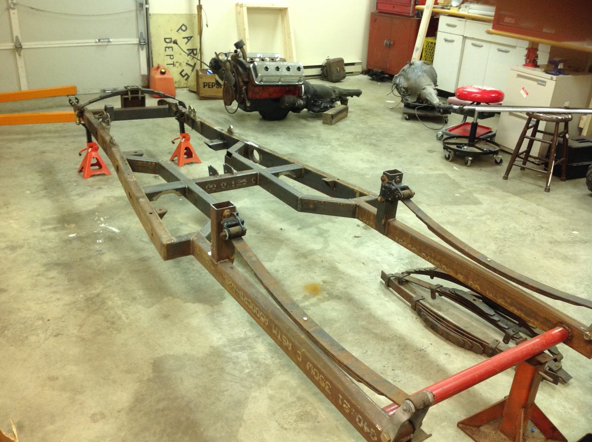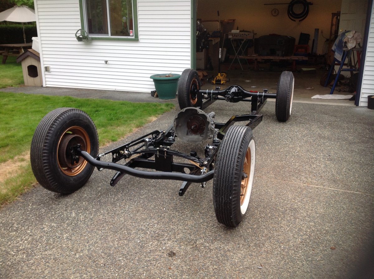 Frame horns have since been bobbed. Rear leafs are front '48 F1. Frame is model A based widened and contoured to follow the T body.