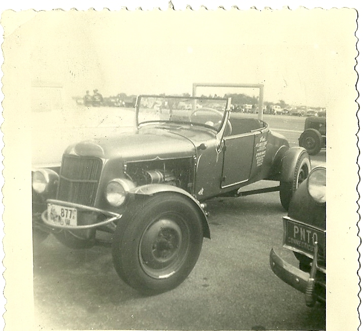 6. This gold colored "T" roadster was owned by Don Gallant of Newington, Connecticut, who has passed away. It is now owned by Paul Gallant, Don's youngest son. who also runs Don's Speed Shop, which has been in business since 1958. Also in the picture is the license plate "PNTO" on the front of "Bud" Pinto's 1937-38 SBC powered Chevrolet coupe. Also, when Don bought the roadster it was powered by a 6 cylinder Chevrolet engine.