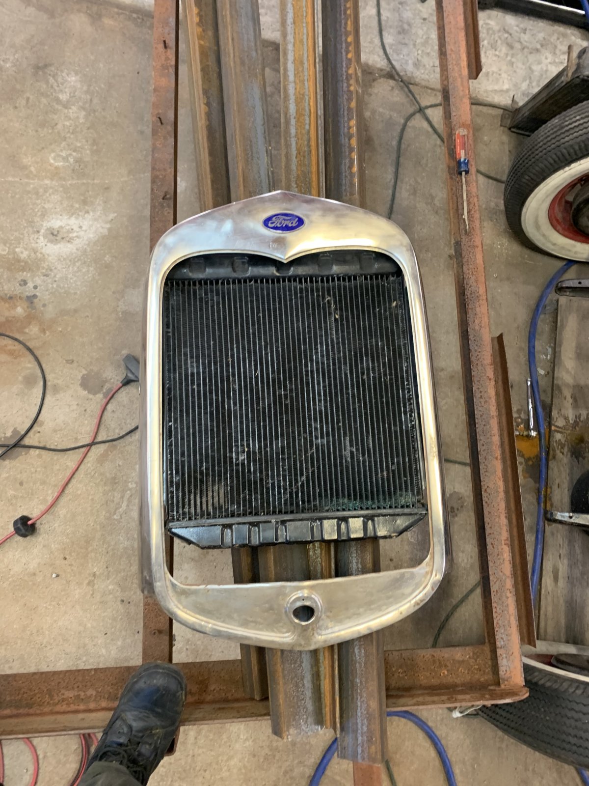 The core braces off the Mustang radiator will make a good foundation for a core support on the T. Looking good! We’ll have to add a filler neck to the bottom tank, but we can’t do that until the grille shell is fitted up. Robin has a junk repro 30-31 shell that he got for pennies as a wall hanger at a swap meet. Being stainless, it will be ideal for experimentation before we cut up my nicer shell. A little more slicing and dicing… That’s looking real damn good! The next step is to weld the grille shell back together but uh, the power never came back, so, that’s that for today. And before we can make the filler neck I need to find a junk 30-31 radiator I can harvest a neck from. I won’t cut up mine - it’s a nice original radiator that cools good and doesn’t leak, so it’d be a real waste to do that. We’ll do as @Fjant did and solder an original filler neck to a water pipe so that it comes out of the opening on the shell like it should.