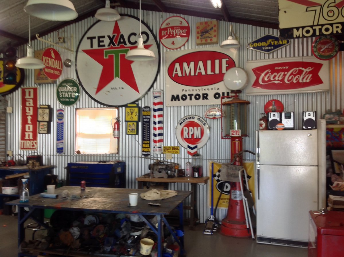 Put in an old wood burning stove (inop) and two recliners, old newspaper pic, hang some stuff from the ceiling, hide the garage door opener with a wooden box, old hanging lights, maybe a gas pump in the corner.....