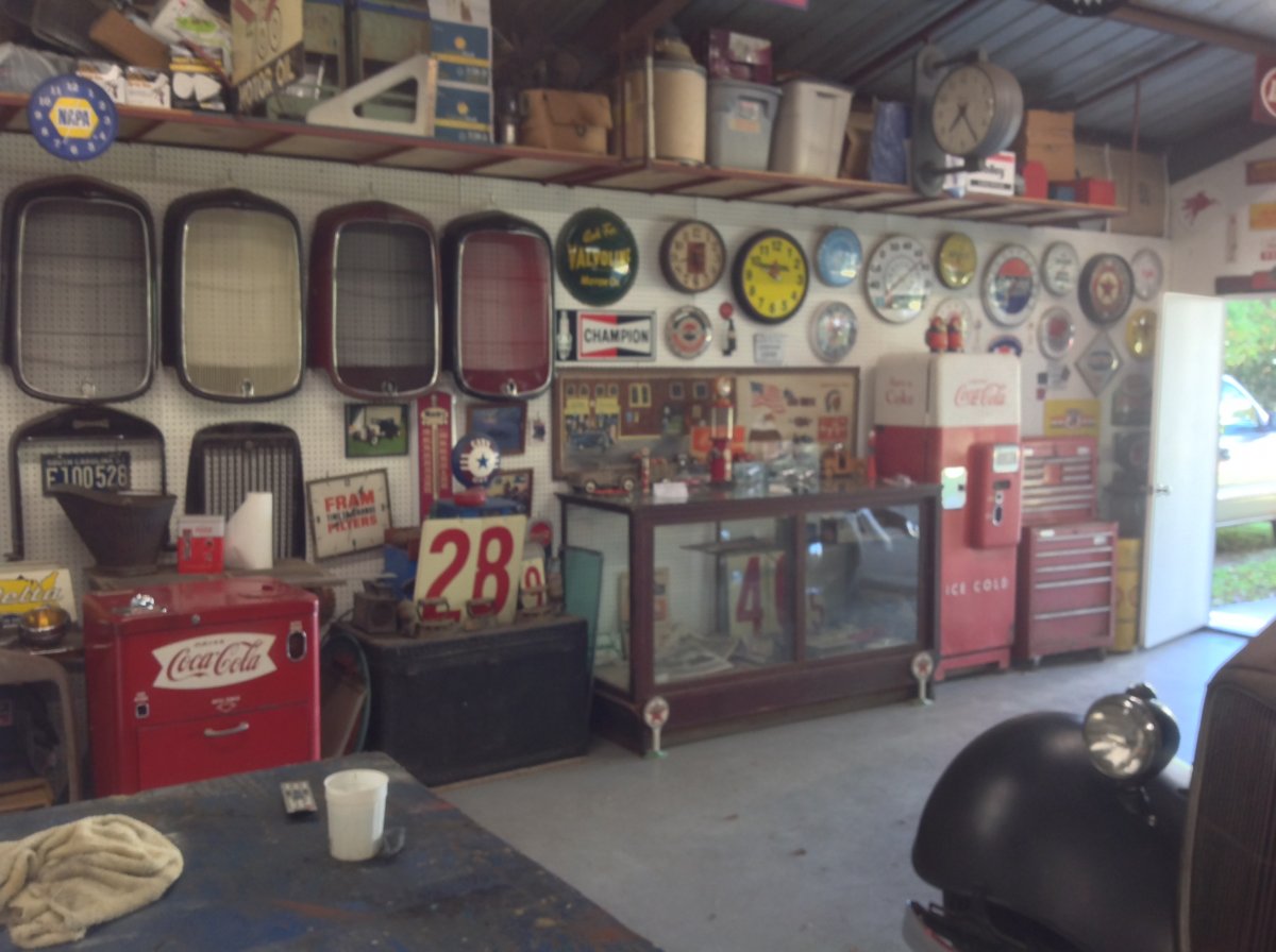 Here's mine. I need more shelving. That'll come this winter. TV, music maker (old Fender guitar amp w/bluetooth attachment), tools, parts, cars n tractor stuff. And lots of wall hangings.