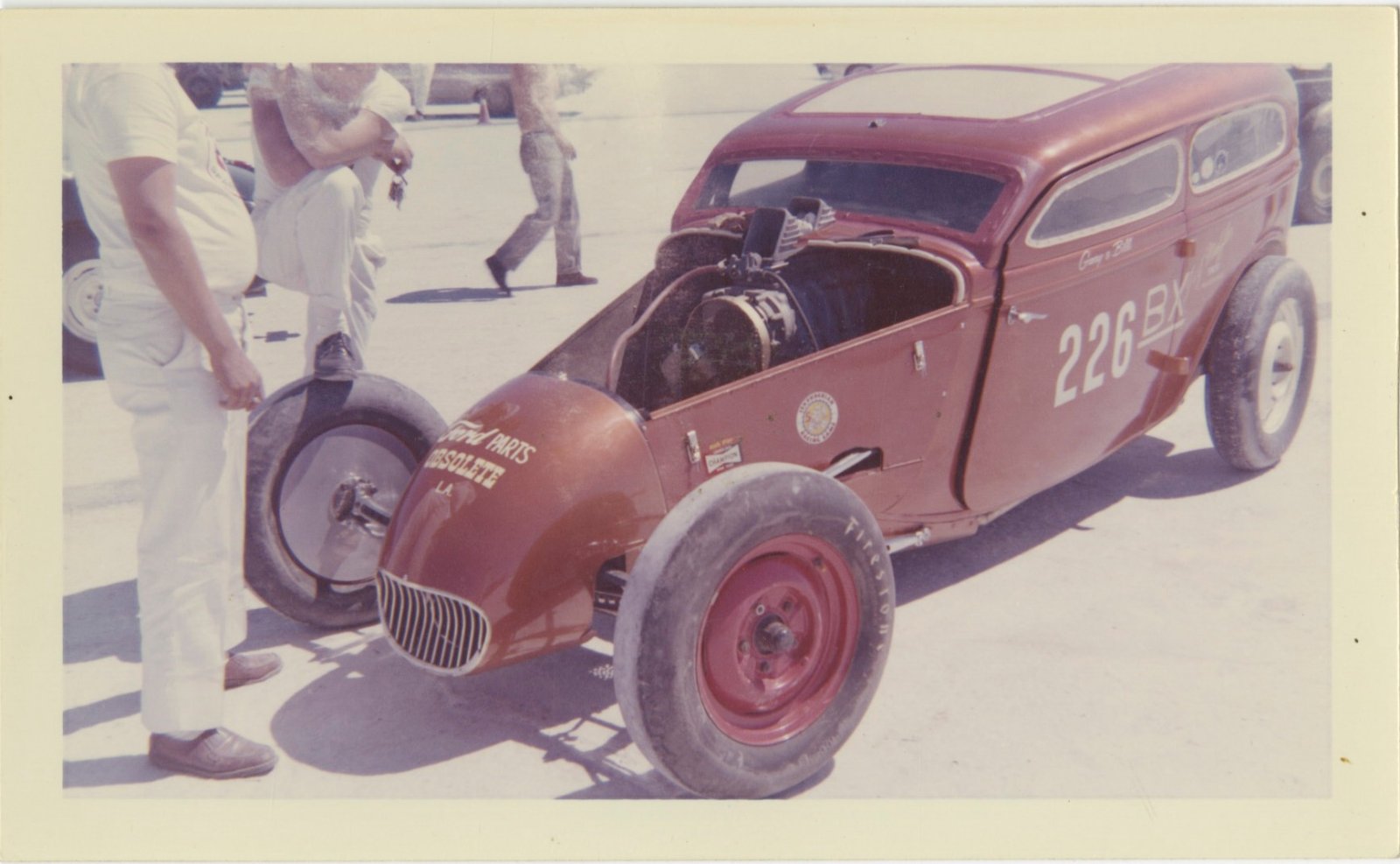 “Rear view of the Ewans and Ramey '34 sedan, at Fontana. The car was built for the salt, but later got a set of bike wheels and slicks to run at the drags. It was immaculate, painted a bright bronze color, with a blown Chrysler. Unfortunately it suffered a stuck throttle on the fire-up road and drove into a phone pole, destroying it. I watched it happen, and then just left, sick that such a nice car was destroyed (driver was ok).” Thanks @296ardun