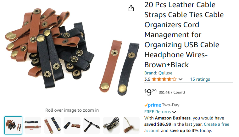 I found these on Amazon, 20 leather wire ties with a snap. You can order just brown or mixed black/brown. They are 2.91" long which equates to about .95" diameter. I will let you know how they look when I get them tomorrow.