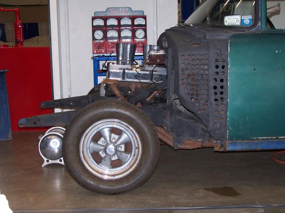 It's being worked on and will get a big block with tunnel ram, 4 spd, 55-59 truck axle up front and has an Olds rear already, rear quarters will get opened up bigger, Cragars all around with the body left as is.
