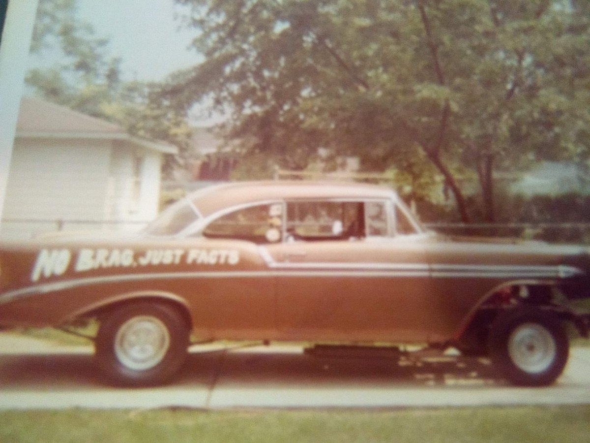 When my dad was 15 or 16, (1965-1966) his older brother Jim had a friend Larry Lymangrover who had a 55 belair hardtop that he beat the firewall in with a sledge hammer too fit a 409, 409 and t 10 in. The car ran 4:88s Lary had a hard time keeping the front end down while running homemade cheater slicks. He hade the cheater slicks by running the car on jack stands and using a church key to groove them. Later he installed a set of shorty Hilborn injectors and sold the car to another friend , Mike. Unfortunately shortly after Mike got the car he mixed the old fuel tabs wrong and it belched in his face, causing 3rd degree burns on his face, neck and arms. No one is sure where the car went after that as it was sold while Mike was in the burn unit. Larry only paid $50.00 for the car in 64, then while stripping out the interior and trunk, found two 50 dollar bills taped inside the spare tire well. He actually made 50 dollars buying the car. I wish I could have been there. I've heard many stories about larry and his Ol Yellar. Another local guy ran a 55 with a 348 and 409 heads. Neither car had a straight axle, but used longer front springs or ball joint spacers.