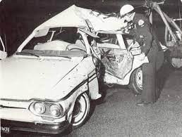 I have also seen this photo, also reported to have been taken at the accident scene. Of the two photos, I have always thought this one is the correct photo. When the engines "fell out", they didn't fall completely out, they were usually still connected to the trans-axle, and kept running. An article on the crash mentioned that a photographer at the scene reached into the car and turned the key off, as the engine was still running. Also, the car did not hit a bridge, it hit a steel light pole. Ernie had just purchased the car a few days before he died, and was returning from a party. It was 1:30 AM, and it was raining, and he took a corner a little too fast and the rear end came around on him. It wasn't the Corvair that caused the crash, it was driver error...