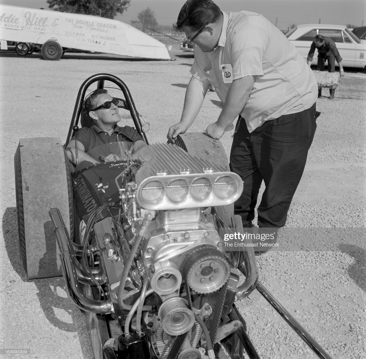 NHRA World Championship and Tulsa Invitational Drag Races - Southwest Raceway. X-terminator III dragster with blown Chevrolet engine. 1965 NHRA World Championship and Tulsa Invitational Drag Races. Tom Hoover slips into his Woody Gilmore built dragster. A & B Speed Shop