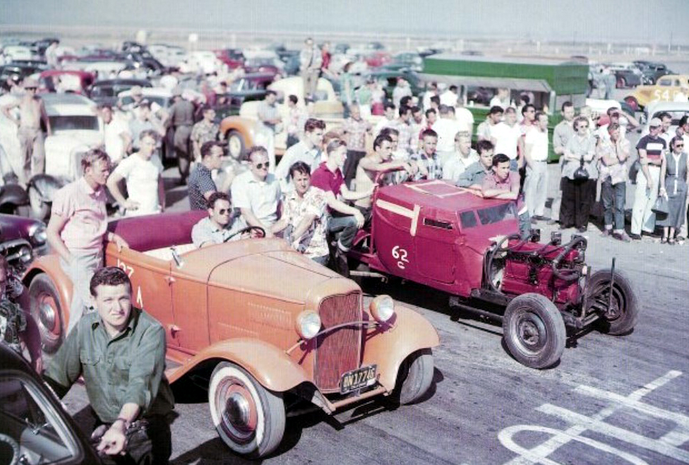 Parked next to the white chopped T Coupe from is this 1932 Ford ex-cabriolet turned roadster. Even back in 1955 this was a hot looking Hot Rod. The all black ’32 Roadster with red steelies and white wall tiers looks stunning as well. Don’t forget to look at the cars in the back row.