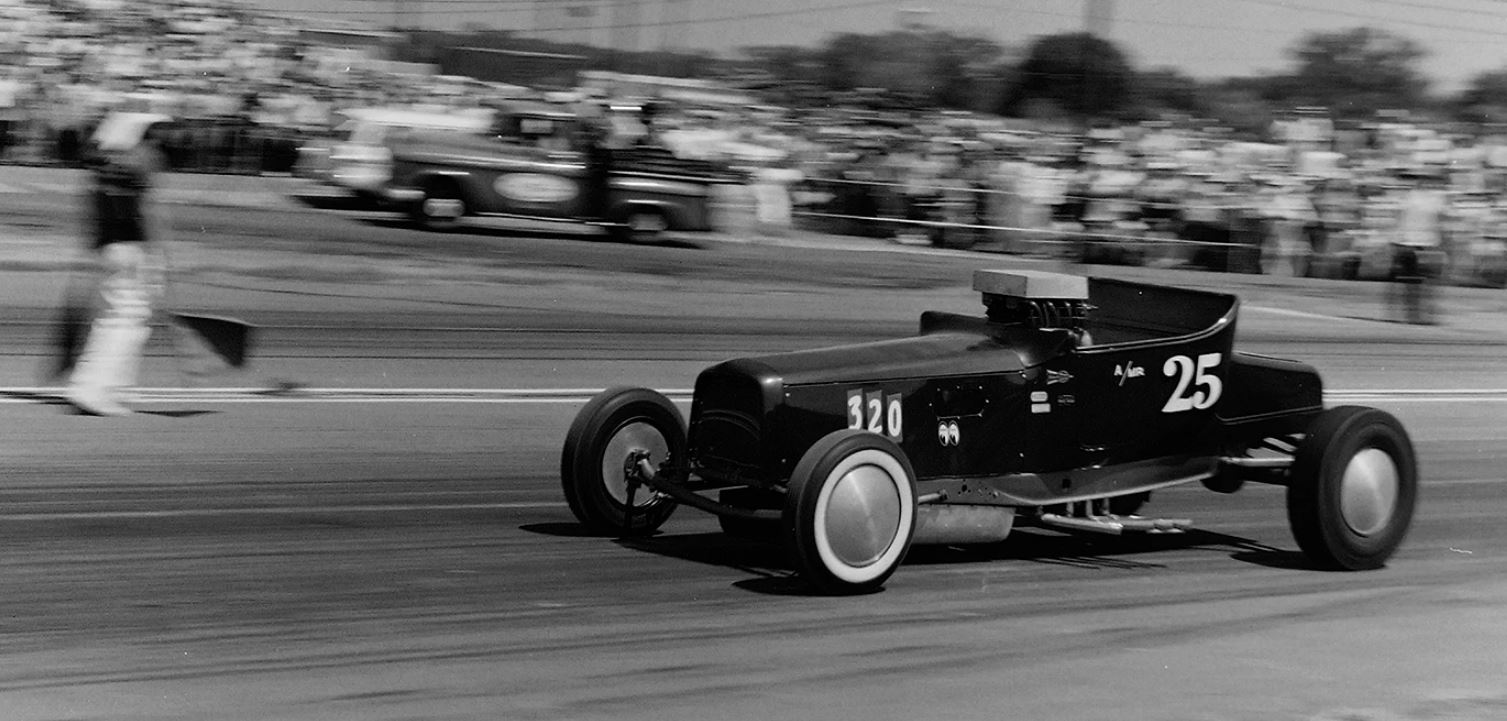 True crazy hot rodding in 1958 resulted in this mid engined 23 Ford on 32 rails with a 51 Hemi... and the driver sitting down in the engine bay, looking through a clear plexi grill