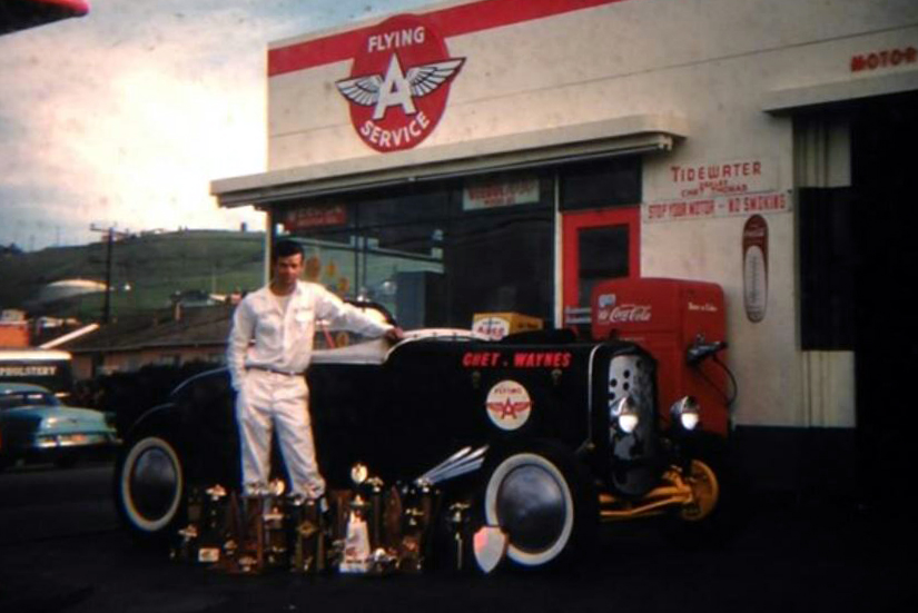 Jack Chrisman's daily driver '29 sedan was a sleeper beast that turned 129 MPH back in 1954, dusting all comers in the A/Fuel Coupe and Sedan class at the drags. Part of its coolness was the blanked out grill insert done by Von Dutch in Kenny's early days of pinstriping experimenting.